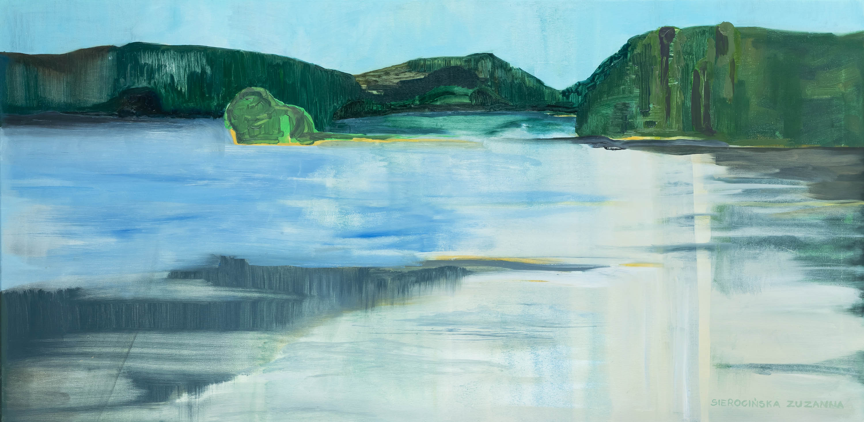olej, płótno, 50 x 100 cm,sygn. p.d.: SIEROCIŃSKA ZUZANNA oraz na odwrocie pieczęcią i sygnaturą: UPALNY DZIEŃ NA POJEZIERZU” SIEROCIŃSKA ZUZANNA ZS 2021