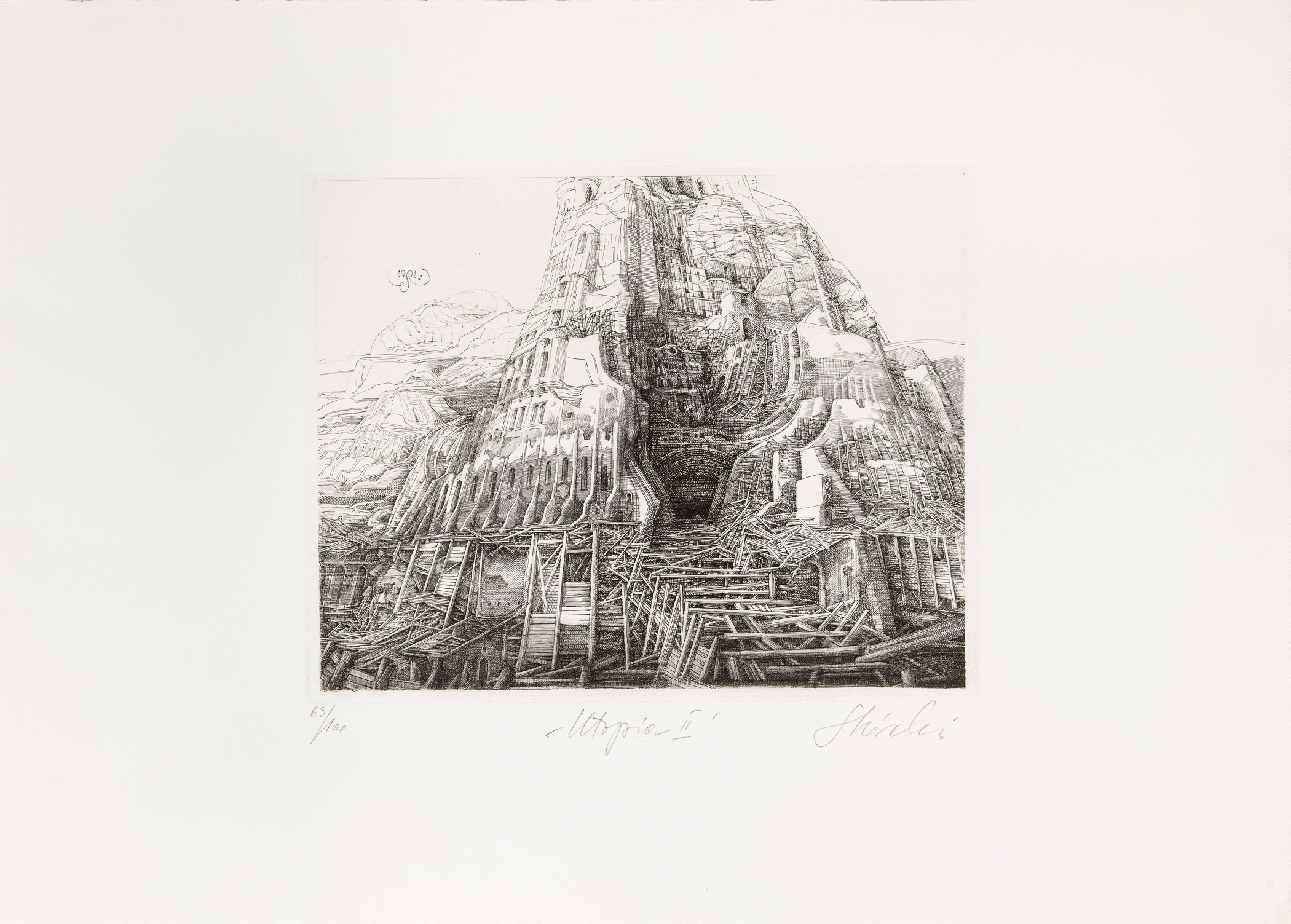 Miedzioryt; wym. komp.: 20 x 25,5 cm; zachowany pełny arkusz; praca sygnowana i tytułowana ołówkiem; praca także sygnowana i datowana na płycie, w obrębie kompozycji; egz. 63/100; poniżej kompozycji suchy tłok: Imp. MK.