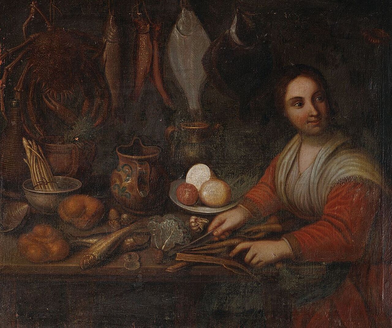 Na odwrocie: papierowa drukowana nalepka: 30 Gegenstück zu Nr. 20 / Rechts die Händlerin hinter einem Tisch Öl auf Leinwand / H. 89 cm B. 110 cm