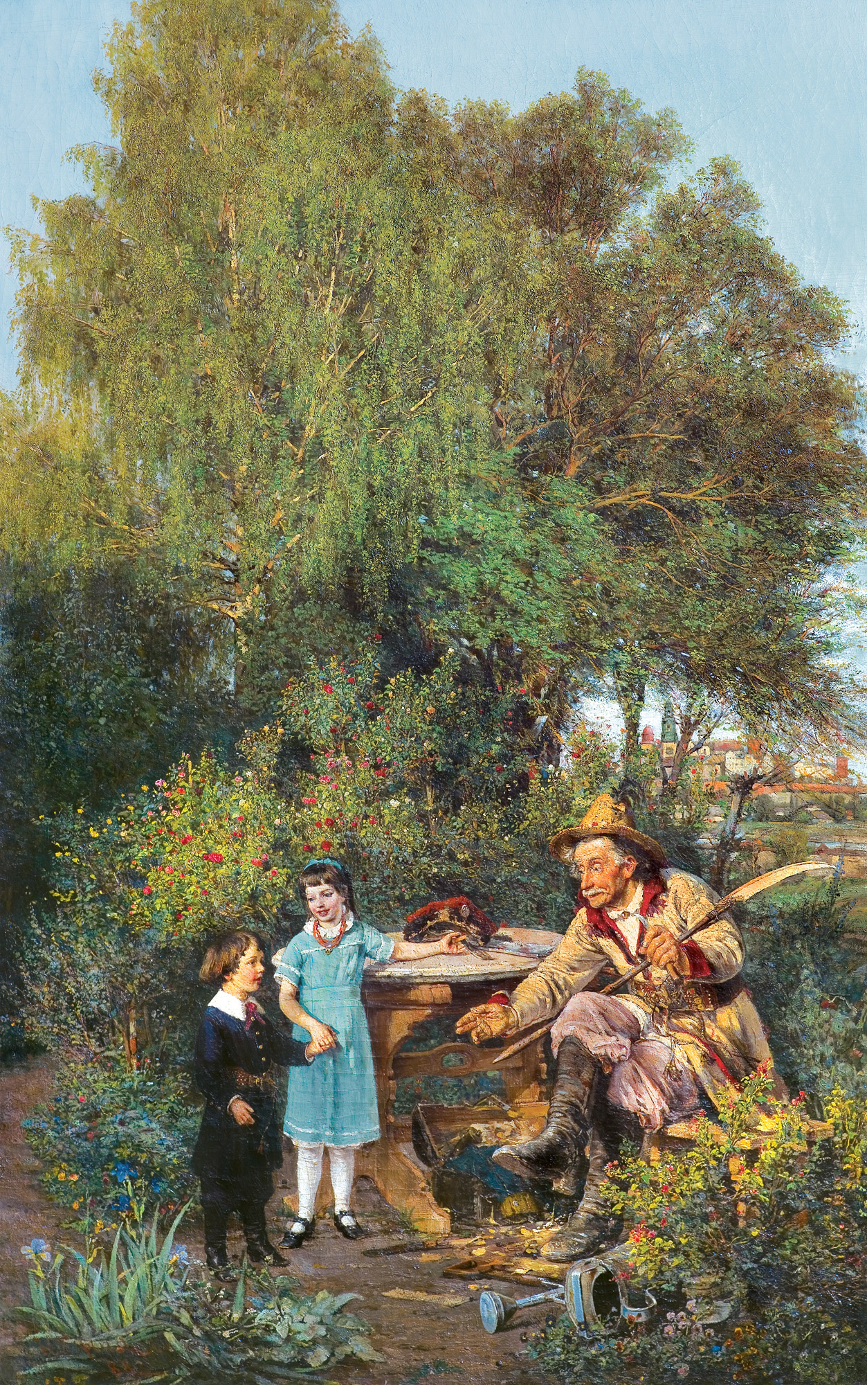 Wg ekspertyzy dr. Lankau, zamieszczonej na odwrocie obrazu, artysta przedstawił na nim fragment ogrodu przy swoim dworze na krakowskich Dębnikach (por.: Dworek w Dębnikach, 1883). Scena przedstawia leciwego ogrodnika, ubranego w krakowski strój, siedzącego przy stoliku. Towarzyszy mu dwójka dzieci i wiele pamiątek z dawnych lat. Przedstawiony chłopiec i dziewczynka, to Staś i Helena – dzieci malarza. Umieszczenie ich w tej scenie nadaje szczególnie osobistego charakteru i autentyczności. Pomiędzy drzewami, w oddali, widać Wzgórze Wawelskie. W tym przepełnionym słońcem i wiosennymi kwiatami, niemal magicznym ogrodzie, dziadek snuje opowieść o służbie ojczyźnie i walce u boku Kościuszki. Wskazują na to zarówno pamiątki w kuferku pod stolikiem, jaki niewielka kosa szykowana dla wnuka. Osobisty gest przekazywania historii młodemu pokoleniu staje się tu metaforą zachowania tożsamości narodowej i międzypokoleniowej ciągłości.