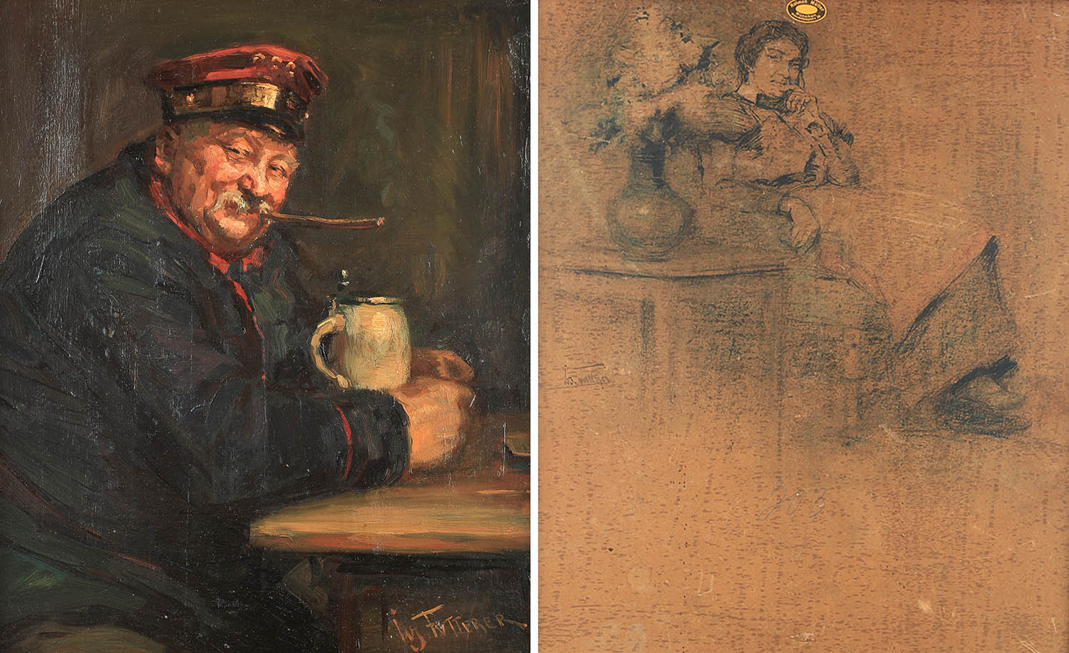 olej, tektura, 38 x 31 cm,sygn. p.d.: Jos. Futterer,obraz dwustronny, na odwrocie:Kobieta we wnętrzu,tusz, papier