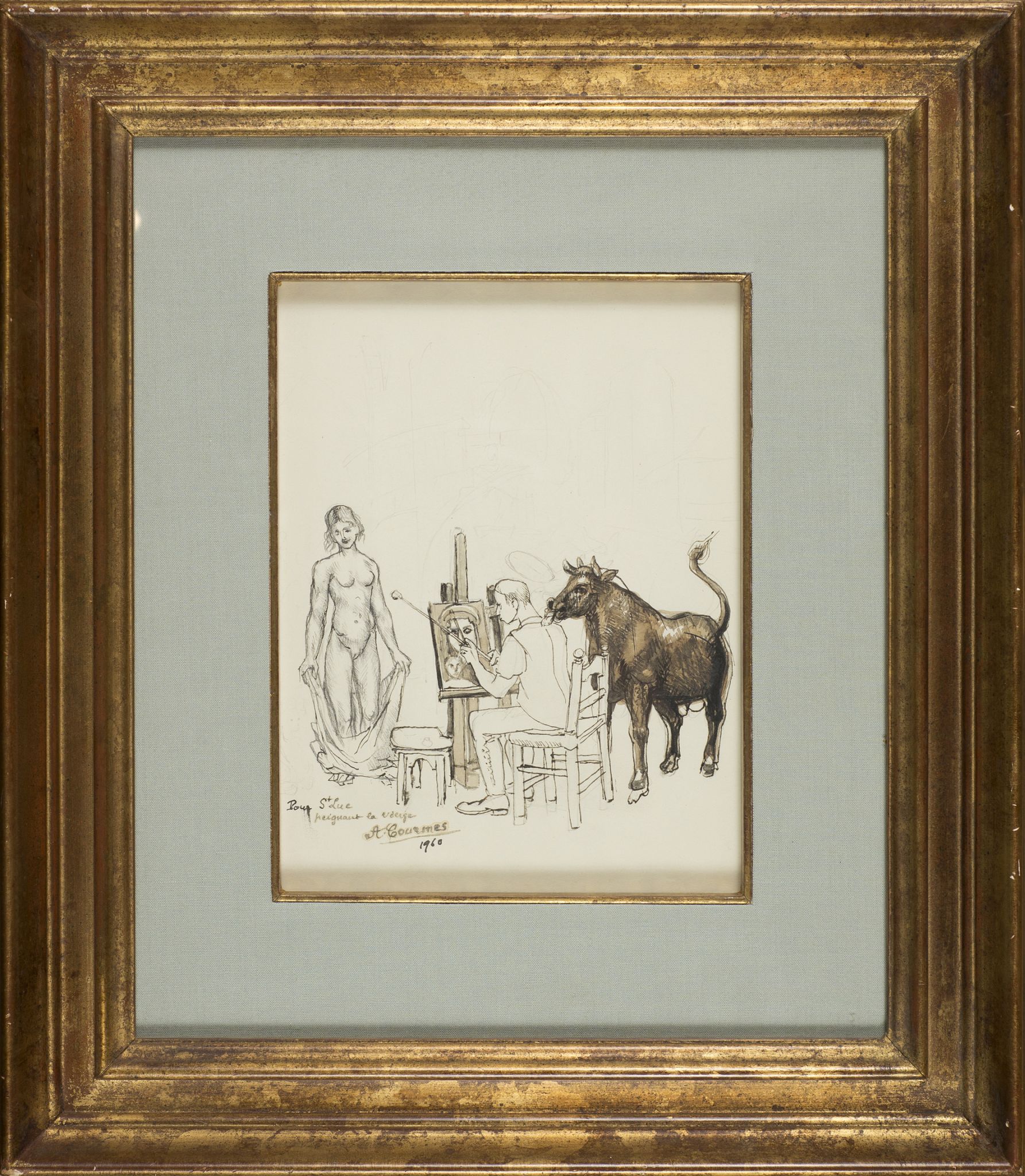 Alfred Courmes był francuskim artystą, a jego kariera obejmowała ponad 60 lat. Zauważony został w 1927 roku, kiedy to namalował portret Peggy Guggenheim. Od tego momentu tworzył w swojej pracowni na Montmartrze, współpracując z największymi nazwiskami swoich czasów (wspólne wystawy z Renée Magrijem). Jego świat nie przestawał się wahać między realizmem a kubizmem, ale Courmes nie chciał się ograniczać, mimo, że zawsze inspirował się mistrzami przeszłości (był wierny warsztatowi klasyków jak Dürer czy Van Eyck). Ta wielowymiarowość artystyczna czyni z Courmes prekursora wielu formalnych wynalazków figuracji lat sześćdziesiątych. Takim przykładem jest oferowany rysunek, gdzie nieco surrealna tematyka figuracji łączy się z kanonicznym zarysem szkicu w tle.