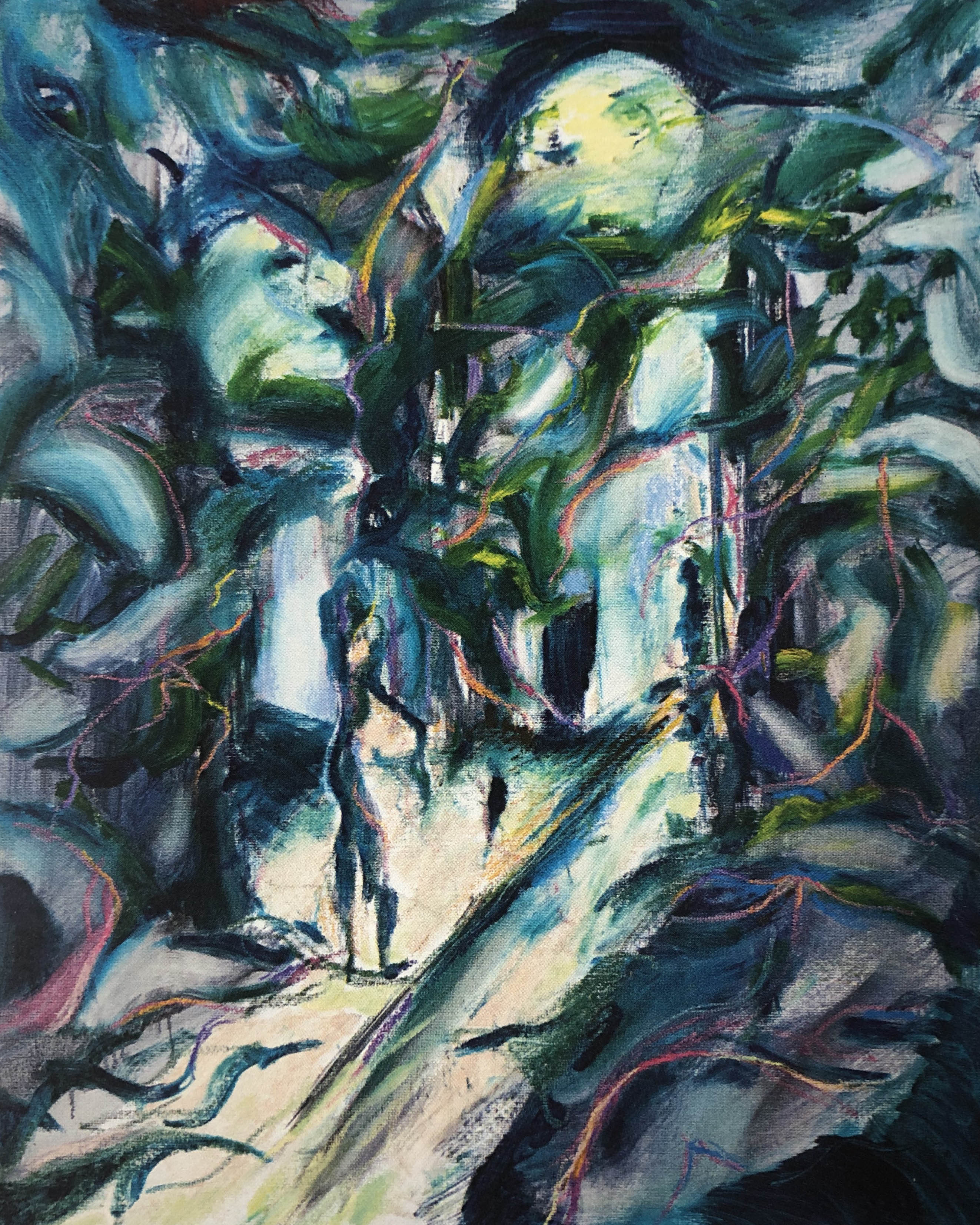olej/płotno, 77 x 62 cm,sygnowany, datowany i opisany: 'W woalu | ciemności... | J. Ciechanowska | 2019'