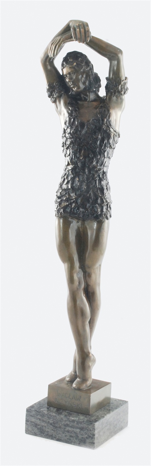 figura tancerza stojącego na palcach z uniesionymi rękoma nad głową - Wacław Niżyński w balecie "Duch róży";