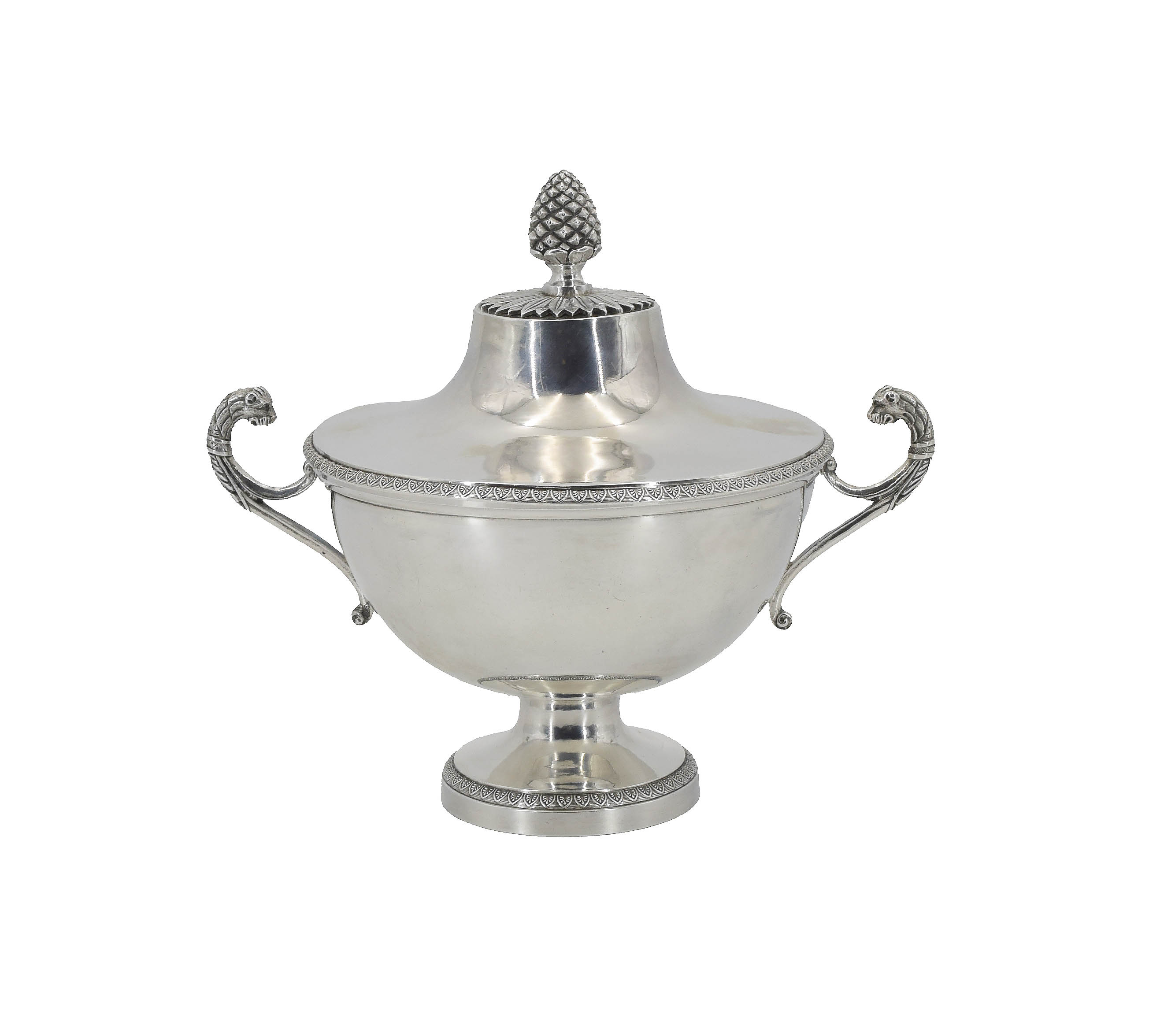 Naczynie na okrągłym cokoliku i stopie obwiedzionej moletowanym pasem kimationu, z krótkim trzonem i gładkim, półkulistym korpusem zakończonym gładką taśmą, z wolutowymi uchwytami po bokach zakończonymi głowami lwów; nakrywa obrzeżona analogicznym pasem jak stopa, pośrodku wywyższona , spłaszczona, zwieńczona szyszką na liściastej rozecie; zwieńczenie nieoryginalne (?)