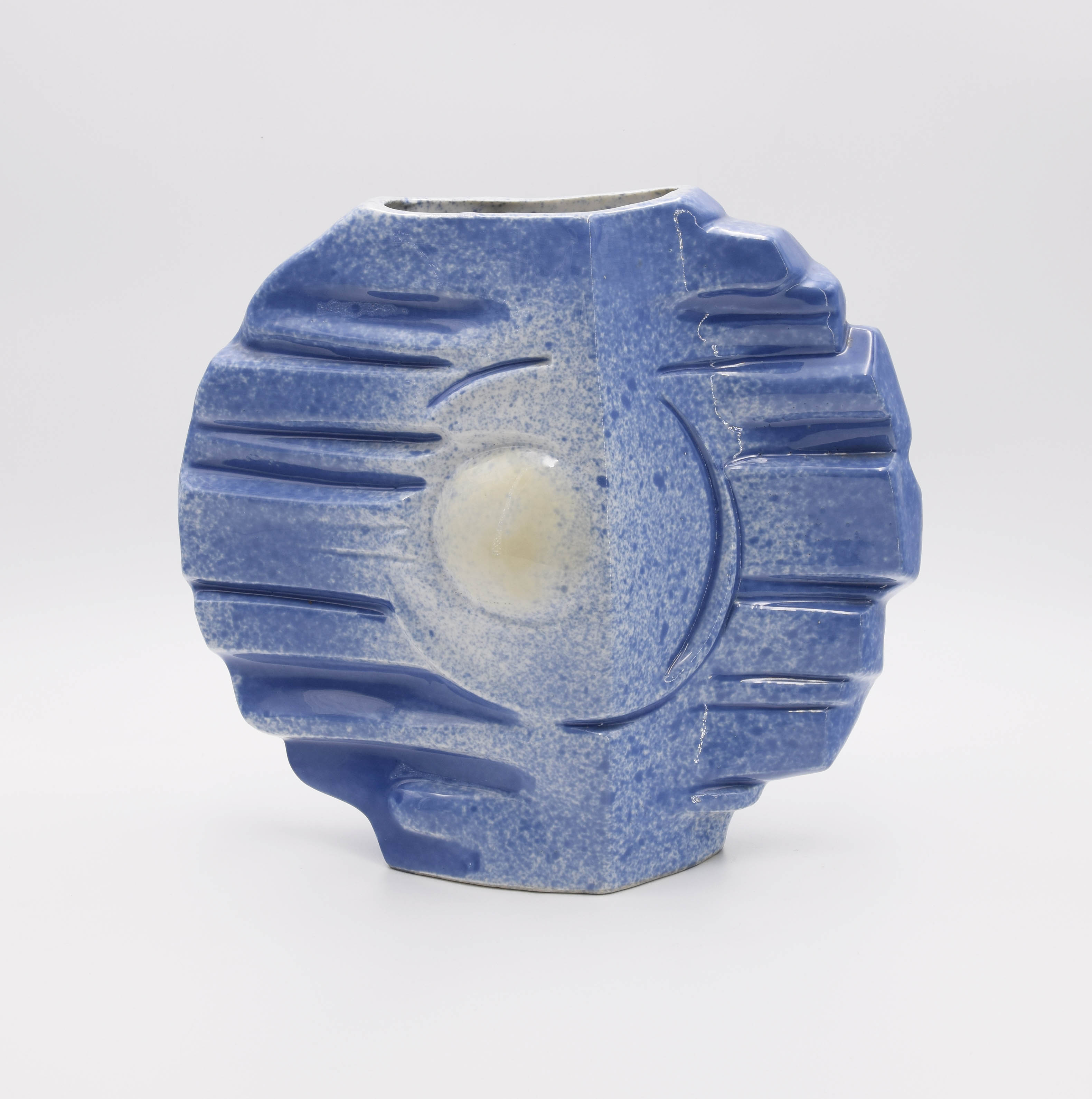 ceramika szkliwiona w kolorze niebiesko-białym; wymiary: 30 x 33 x 11 cm;sygn. i dat. na spodzie: GHadyna / 1988 (wyciśnięte w masie).
