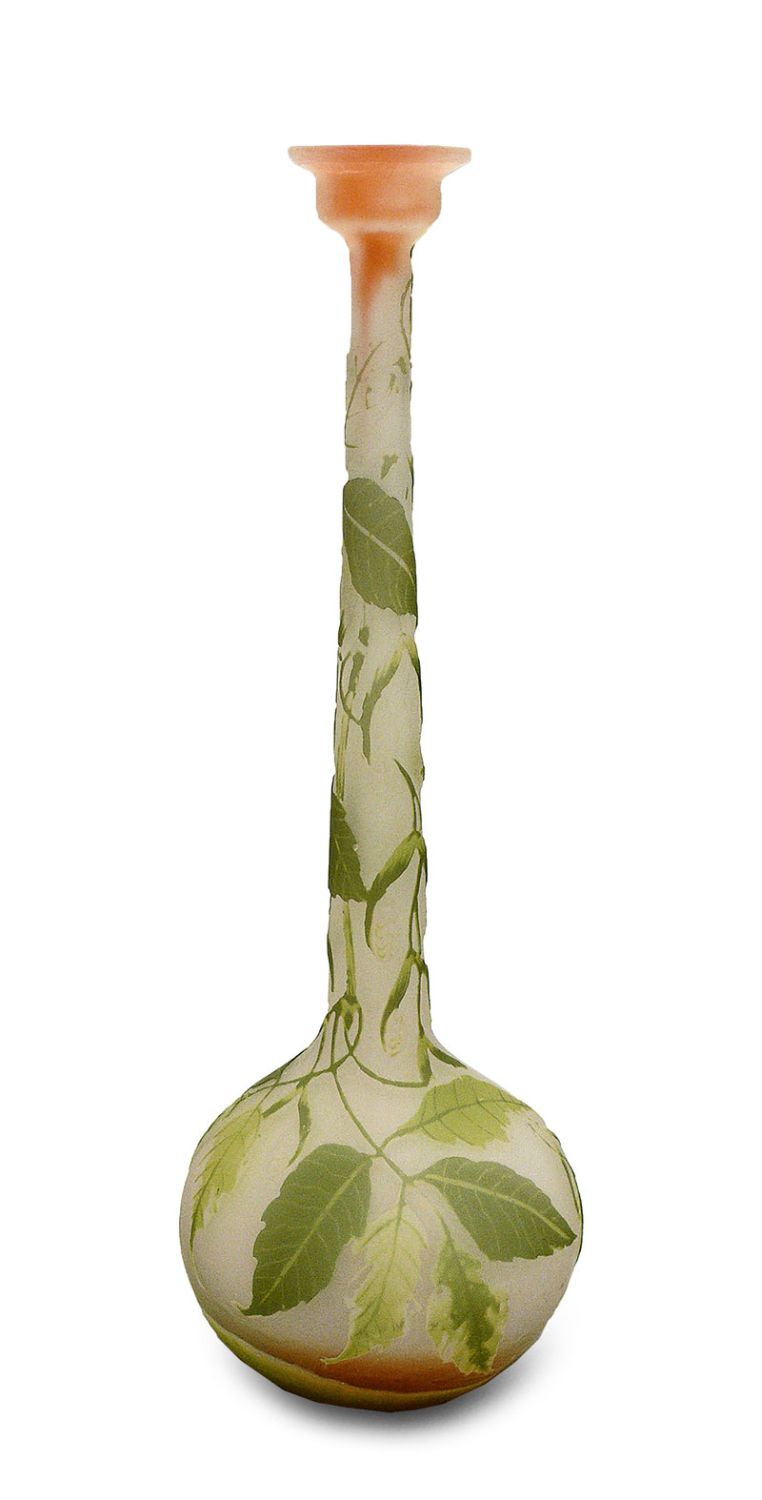 Emile Gallé, Nancy, l. 1900-1904szkło bezbarwne podmalowane pomarańczowym proszkiem szklanym, powlekane warstwą szkła zielonego, trawione; sygn: Gallé; wys. 31 cm