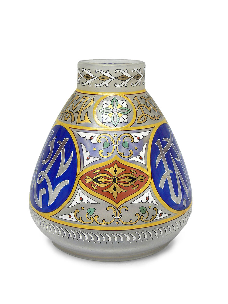 Fritz Heckert, Petersdorf, ok. 1900 r. proj. Otto Thamm, dekor. Adolf Heyden szkło bezbarwne, iryzujące, malowane emaliami i szwarclotem, dekoracja orientalna; sygn. na spodzie; wys. 19,5 cm