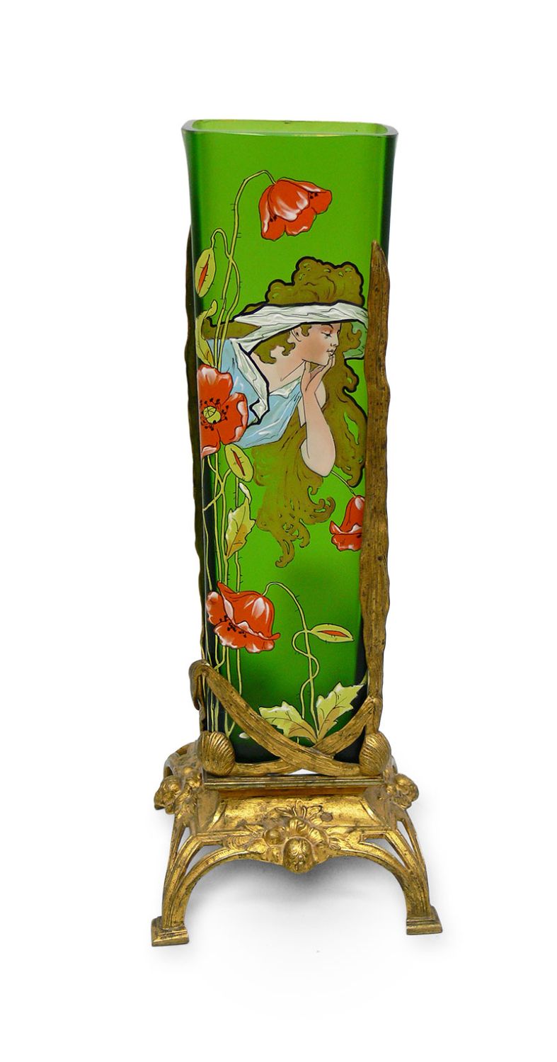 Bohemia, ok. 1900 r.szkło zielone, malowane farbami emaliowymi, okucie z metalu złoconego, dekoracja w postaci wizerunku kobiety oraz maków; wys. 39 cm