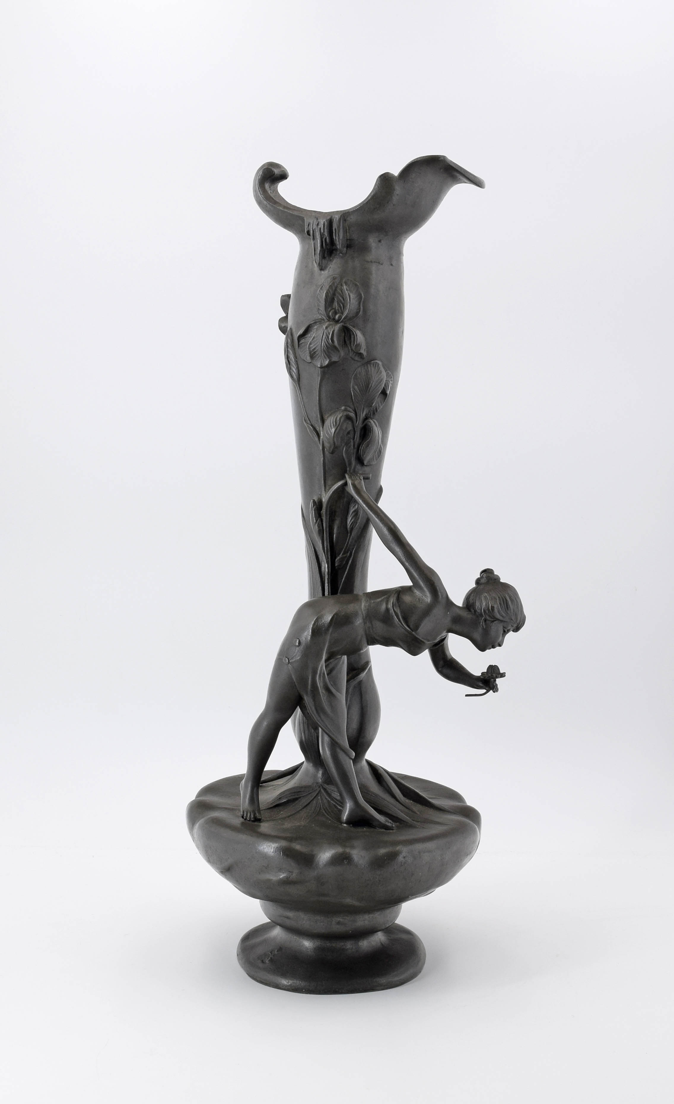 Stopa kolista; część dolna wazonu półkulista, z pełnoplastyczną figurką kobiety zbierającej kwiaty; wyżej wydłużona, wrzecionowata szyja naczynia zdobna reliefową, secesyjną dekoracją floralną (irysy), zakończona falistym wylewem.
