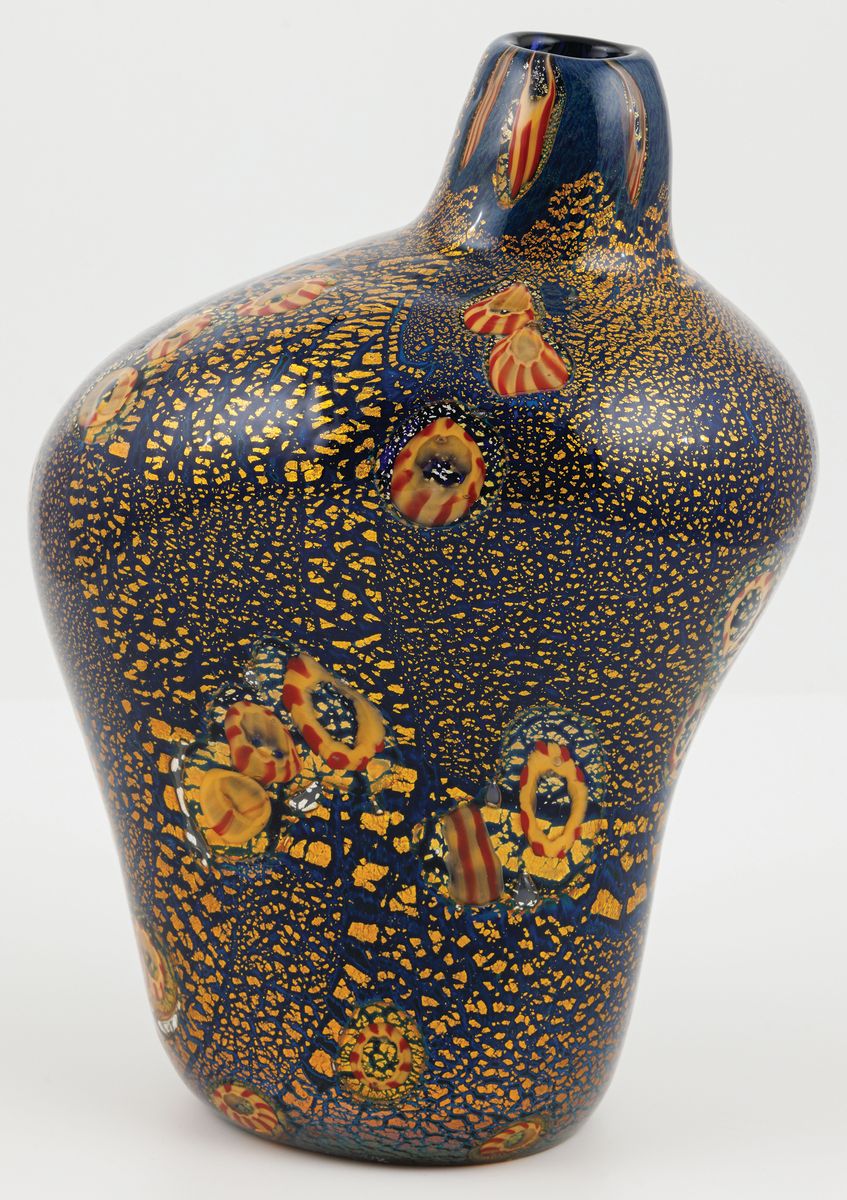 Wykonanie: Włochy, Murano, Arte Vetraria Muranese (A.V.E.M.), 1960-70Szkło kobaltowe, millefiori, płatki srebra i złota; wys. 24 cm