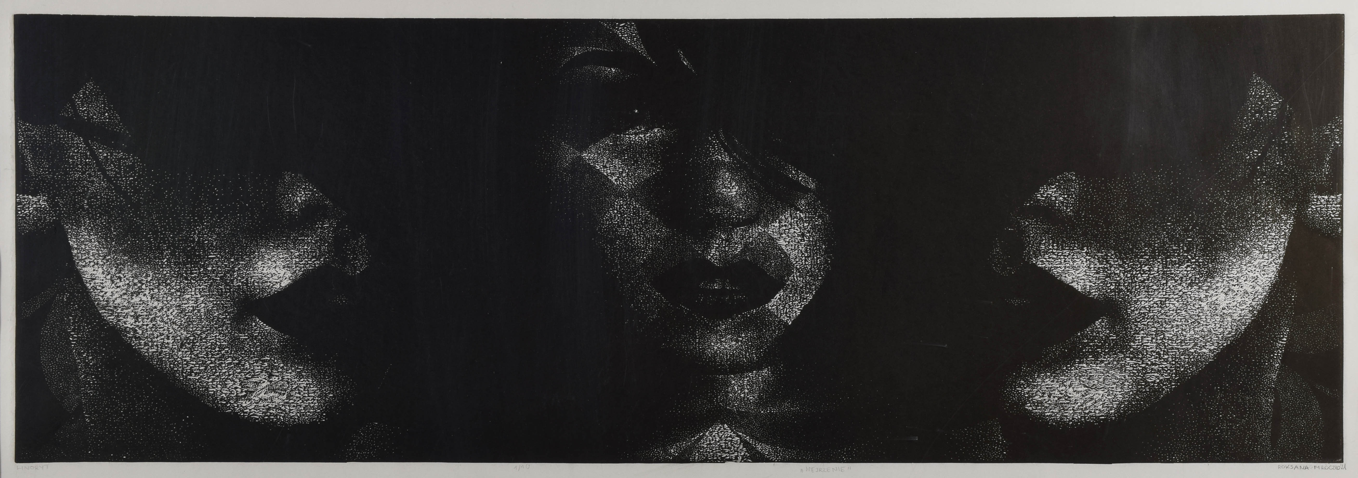 linoryt, papier; 29,5 x 87 cm (wymiar kompozycji), 48 x 90 cm (wymiar arkusza w świetle passe-partout); grafika opisana u dołu od lewej: LINORYT / 1/10, „WEJRZENIE”, ROKSANA MROCZKO'21 (ołówkiem).
