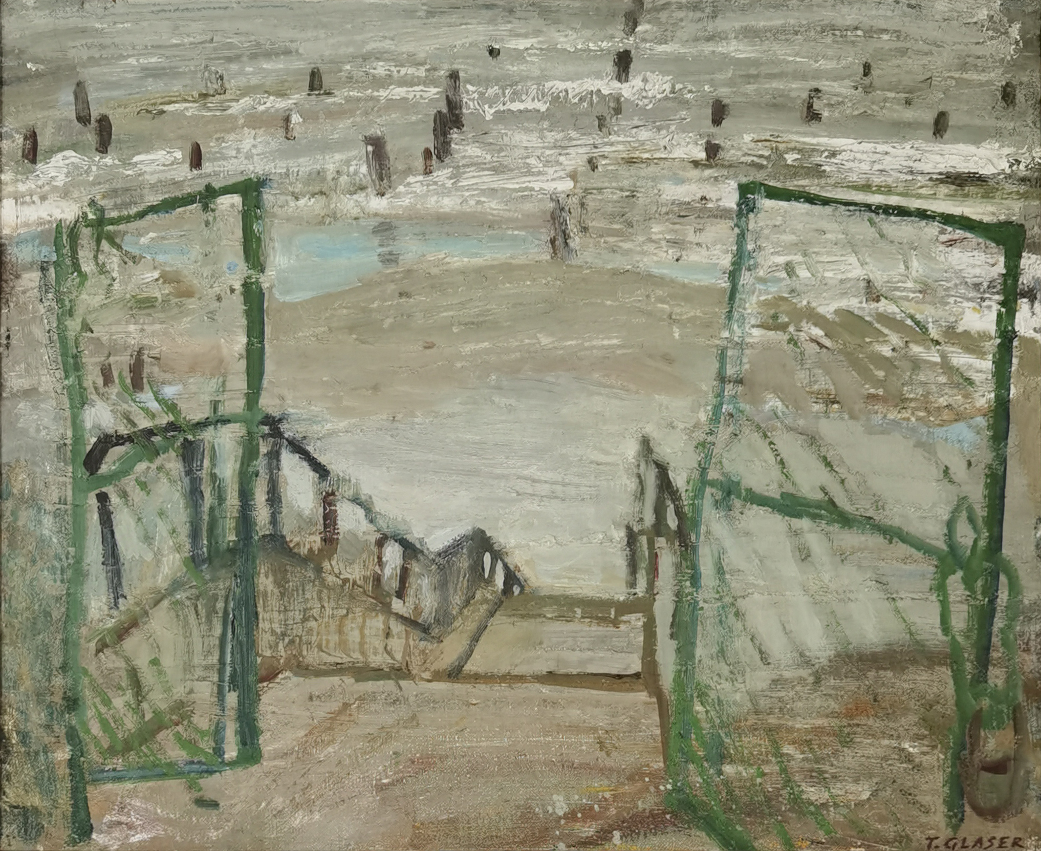 na odwrocie, na krośnie malarskim nr: 99 (zielonym flamastrem) oraz nalepka z informacją o obrazie: Teresa Glaser / "Wejście na plażę II" / olej, 45/55 cm; oraz na płótnie nr 25 (białą kredą; oraz stempel (prawdopodobnie wywozowy) z dopisanymi numerem.