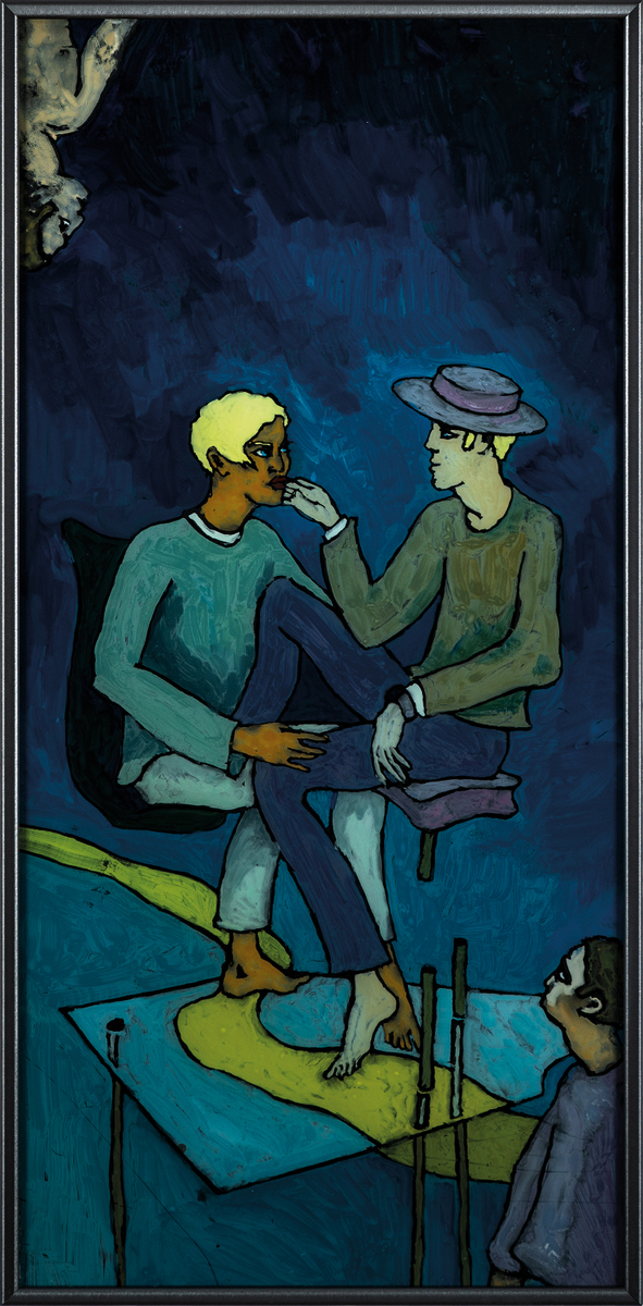 im. Wojciecha Gersona w Warszawie wyjechał do Nowego Jorku podbijać mekkę i stolicę ówczesnego świata artystycznego. Miasto okazało się pożywką dla stworzenia przestrzennych asamblaży i serii rysunków wystawionych w prywatnych nowojorskich galeriach. Dzięki temu prace trafiły do tamtejszych kolekcjonerów. To jednak nie mityczna Ameryka staje się inspiracja dla kolejnych realizacji. Po niemal półtorarocznym pobycie w Stanach autor wraca do Europy. Prowadzi życie wagabundy; Berlin, Monachium, północne Włochy aż wreszcie następuje przełom w Portugali, która na rok zostanie przystanią. W Lizbonie utrzymuje się z renowacji fresków i starego malarstwa tam odkrywa dziwiętnastowieczne malarstwo na szkle. Fascynacja unikalną techniką, jej odrębnością i specyfiką daje asumpt do stworzenia w lat 90' XX w. kilkunastu prac na szkle inspirowanych doświadczeniami i wydarzeniami z Lizbony. Z tego okresu pochodzi „Wide Square" - praca prezentowana na aukcji, opisująca enigmatyczne, pełne niepokoju relacje międzyludzkie, fascynacje z elementami niejednoznacznej erotycznej gry.