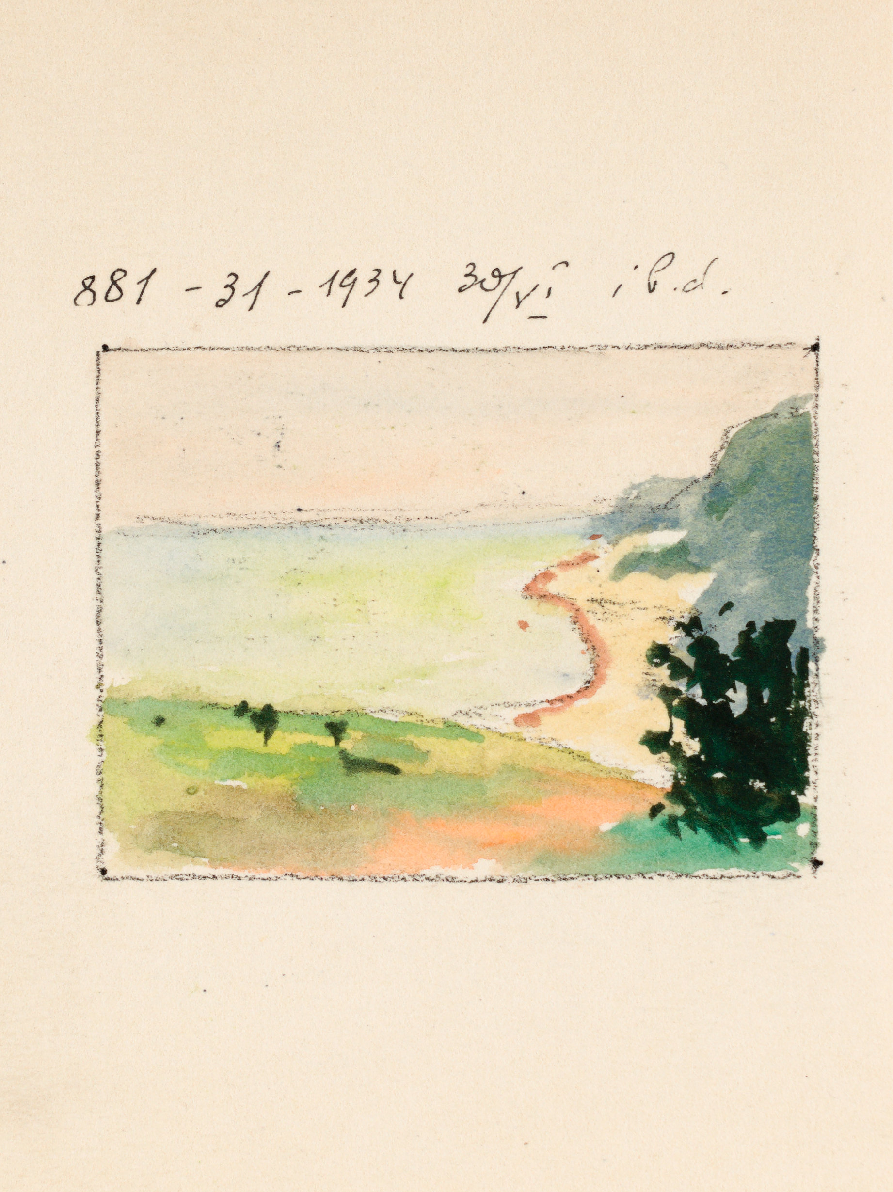 akwarela, gwasz, brystol; 14,1 x 9,7 cm (wym. arkusza), 5 x 6,7 cm (wym. rysunku);opis. autorsko u góry: 881-31-1934 30/VI ib.d.