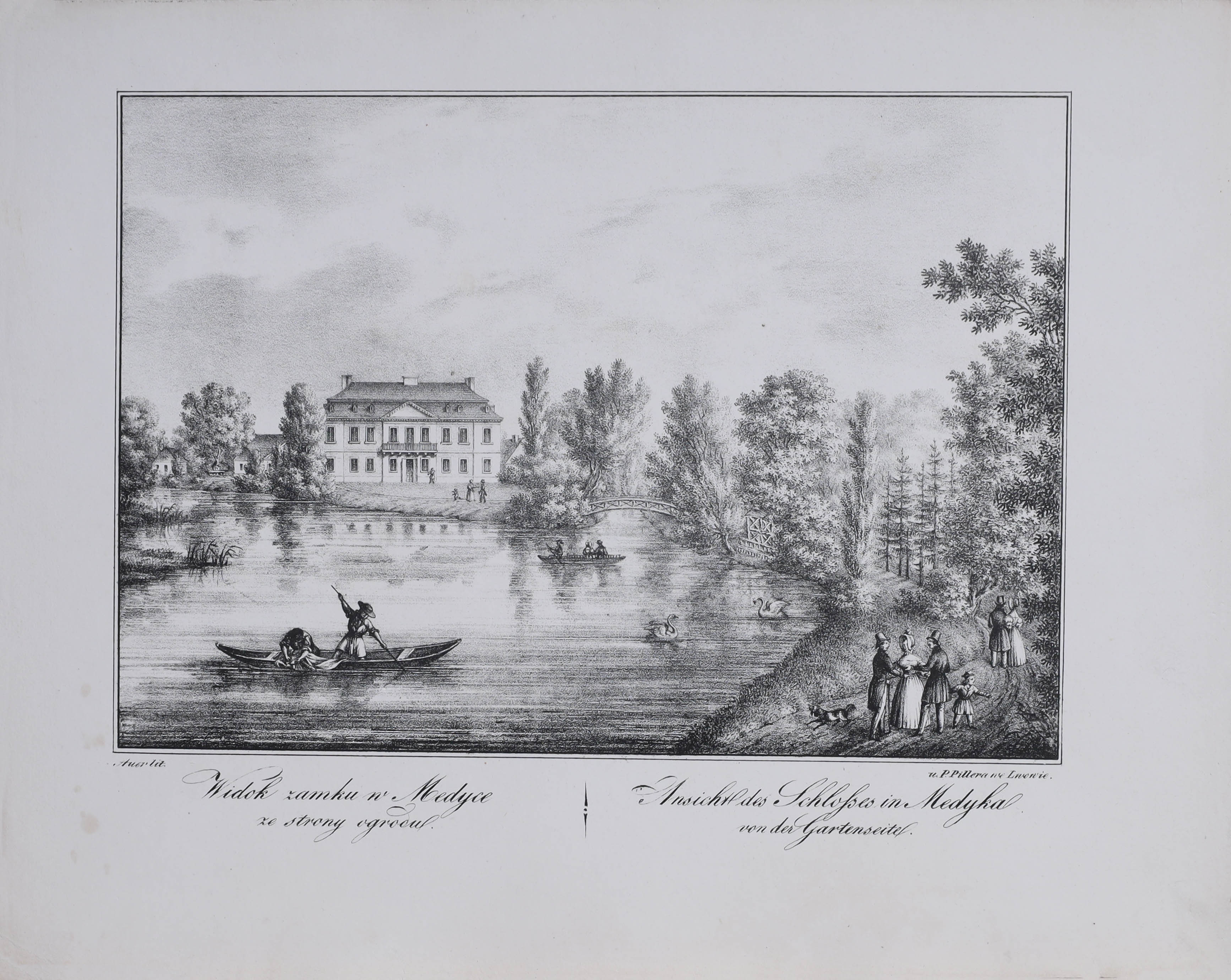 litografia, papier, 24 x 30,5 cm; Ansichtfdes Schlofses in Medyka von der Gartenseite / u. P.Pillera we Lwowie