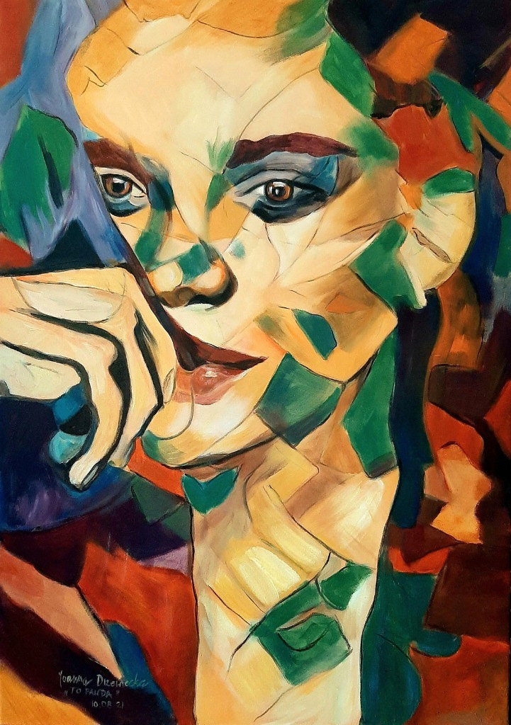 akryl, płótno 100 x 70 cm;sygn.l.d. Joanna Drzewiecka "Wiedziałam" 22.08.21na odwrocie certyfikat autorski z odręcznym podpisem
