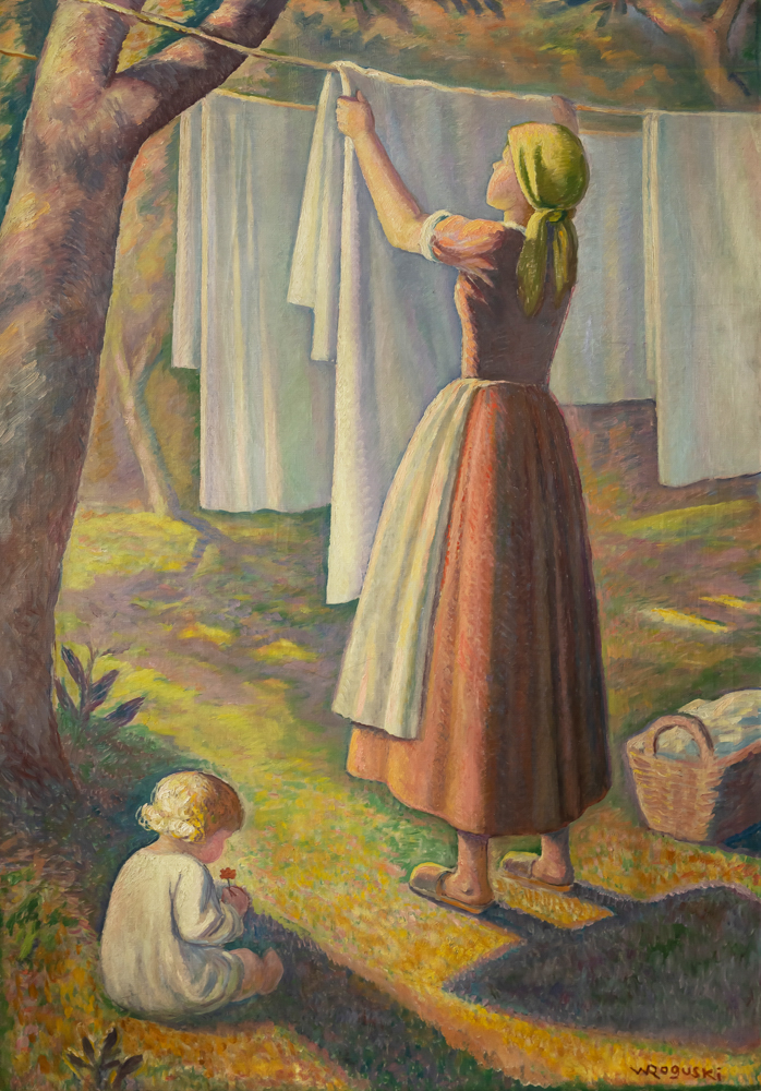 Prezentowany obraz Władysława Roguskiego cechuje zarówno prostota, jak i dekoracyjność. Scena rodzajowa przedstawiająca kobietę rozwieszającą pranie i dziecko siedzące u jej stóp, wypełniona jest liryzmem. Artysta poprzez spokojny nastrój dążył do uzyskania harmonijnej kompozycji. „Inspiracje czerpał zarówno ze sztuki quattrocenta, z freskowego malarstwa florenckiego i sieneńskiego, jak i z osiemnastowiecznych podhalańskich malowideł na szkle. […] Dekoracyjny charakter tych wizerunków uwydatniał giętki kontur obiegający płaskie pola barw