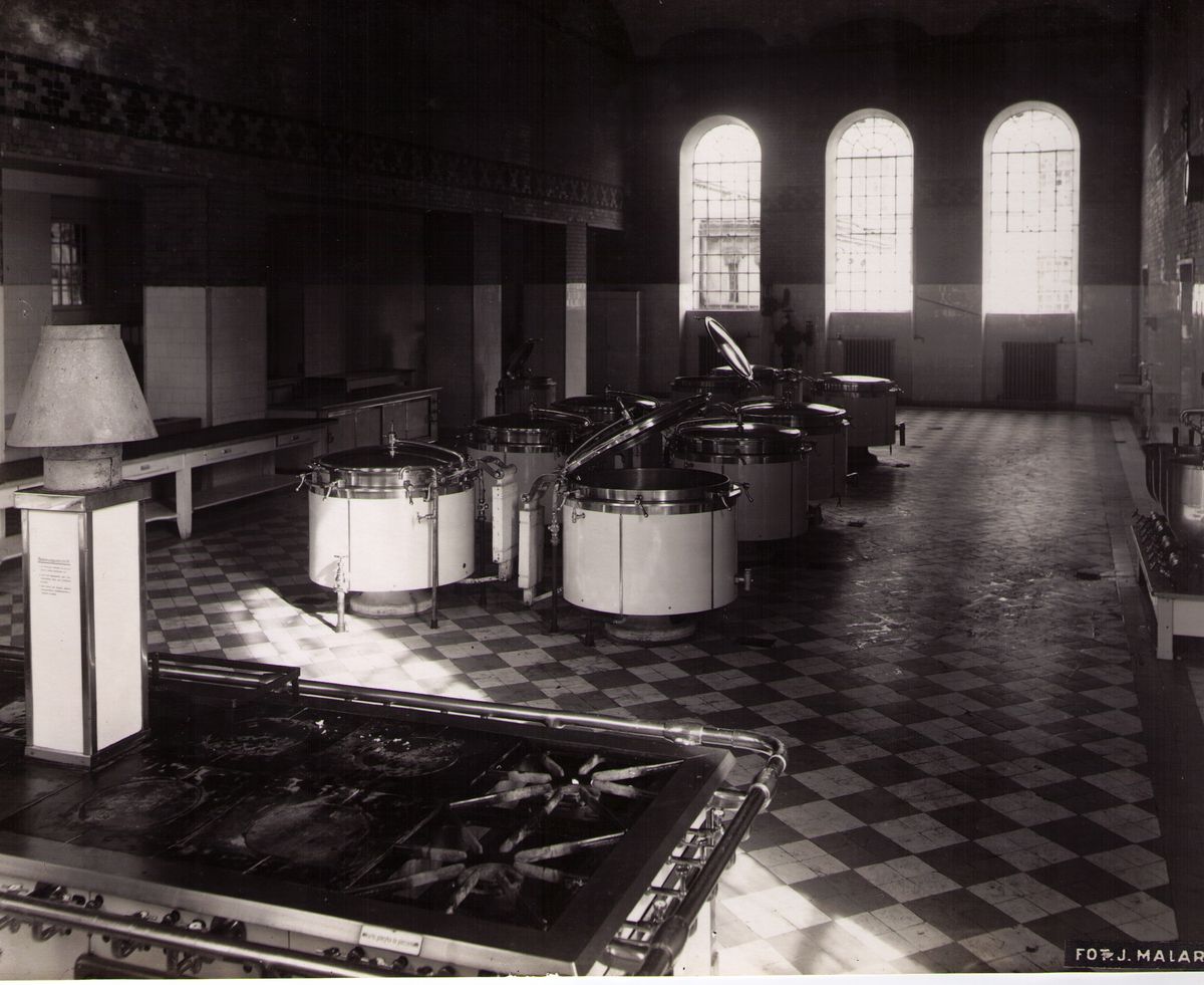 Na odwrocie stempel:Agencja Fotograficzno-Prasowa / Jan Malarski / Chmielna 10, tel. 224-20 / Prawo reprodukcji zastrzeżone; maszynopis: Wnętrze kuchni szp. Dzieciątka Jezus dnia 13.X.1930 roku