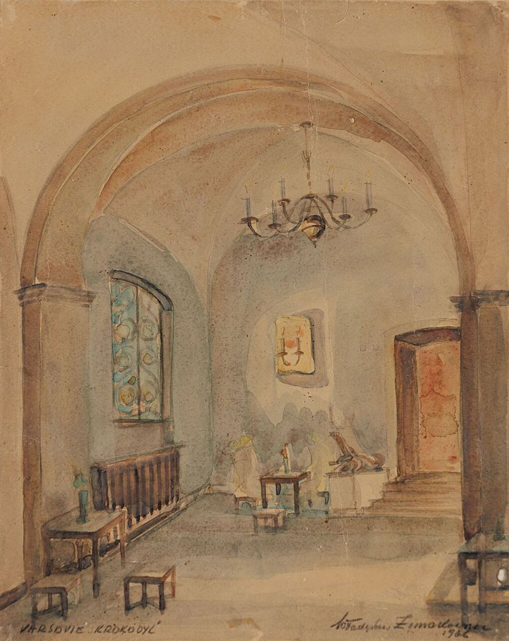 Akwarela, papie; 38 x 30 cmSygnowany p.d.: Władysław Zimadowicz / 1966; l.d.: Varsovie „Krokodyl”Oprawiona