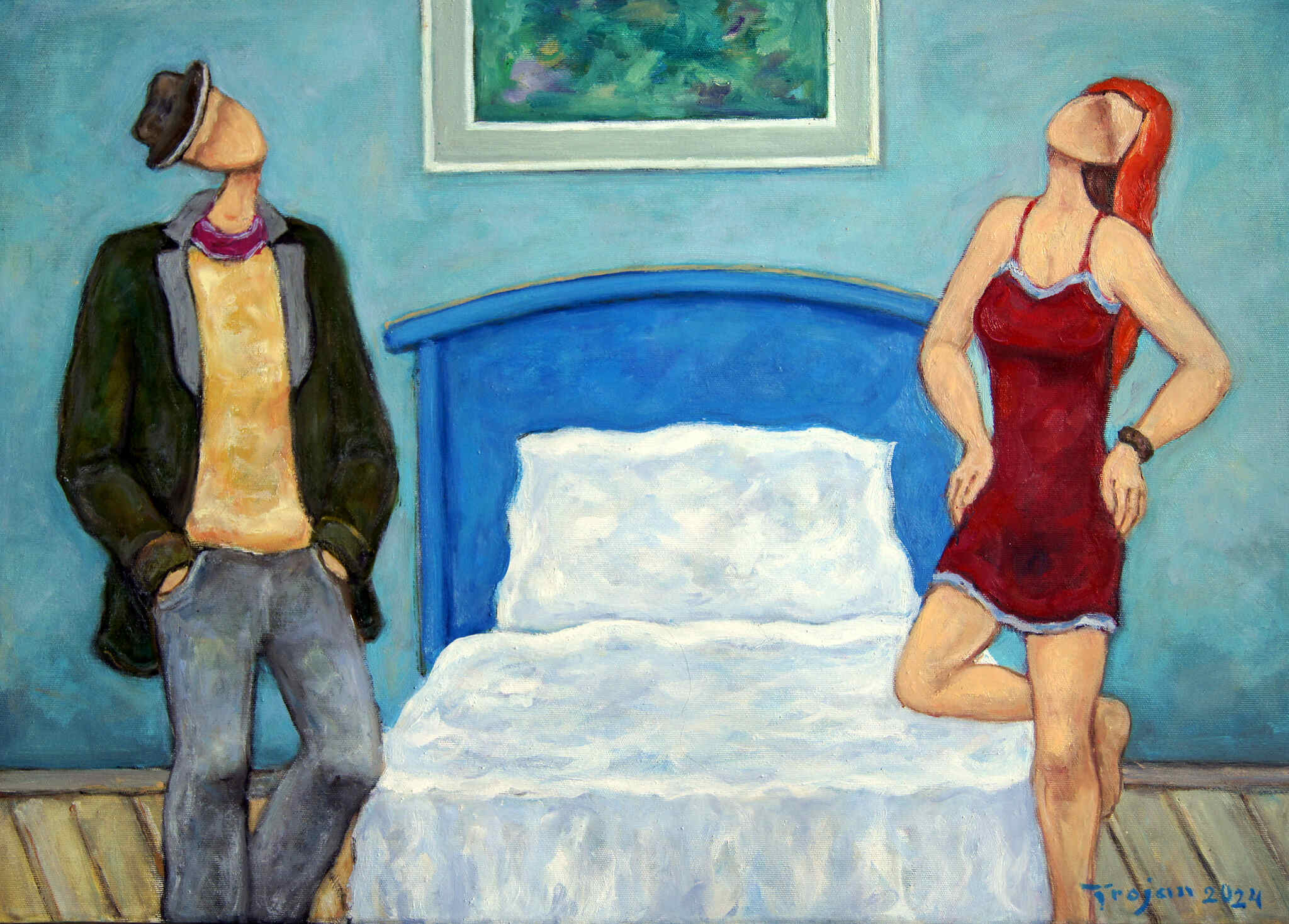 Wnętrze z niebieskim łóżkiem, 2024