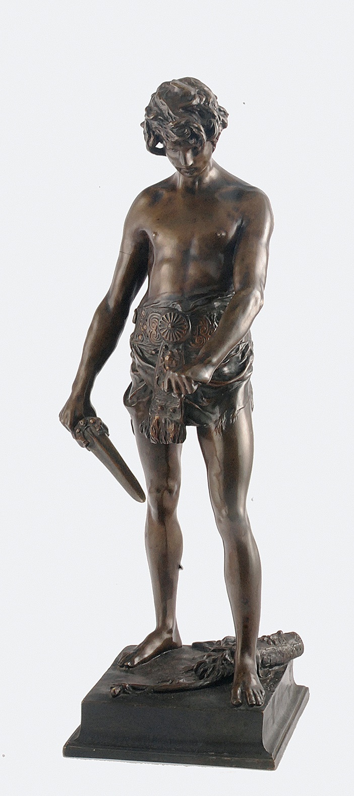 Figura nagiego młodzieńca w przepasce skórzanej na biodrach, podtrzymywanej przez szeroki, ozdobny pas. Wojownik stojący w rozkroku, w prawej ręce trzymający miecz; lewa ręka wysunięta do przodu, z zaciśniętą pięścią. U jego stóp leży kołczan i łuk. Na wierzchu kwadratowej podstawy sygnatura: "LABATUT". Z boku w kole: "PARI"; drugi znak kolisty z sylwetką klęczącego mężczyzny z młotem i napisem w otoku: "SYNDICATH. DE FABR. DE BRONZES. UNIS FRANCE 1818".