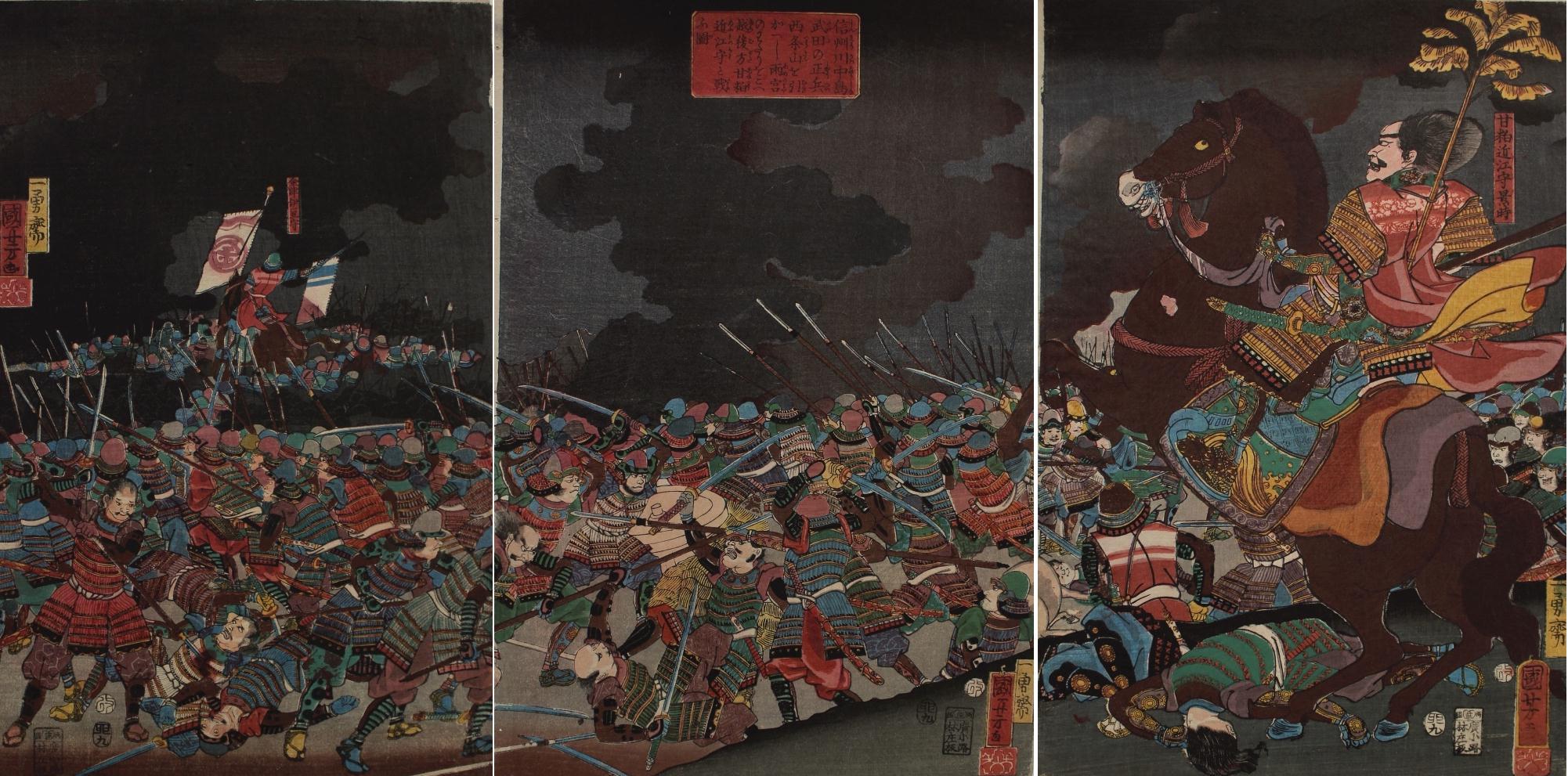 Wojska Takedy Shingena po zejściu z góry Seijo i przeprawie przez rzekę Amenomiya, walczą z Amakasu Kagemochi pod Kawanakajima w prowincji Shinshu-tryptyk, 1855