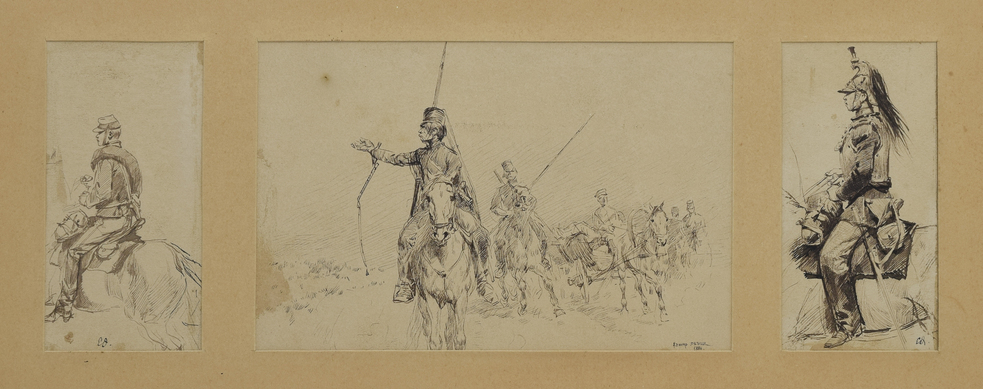 piórko, tusz, papier; 11 x 5,3 cm; 11 x 16,5 cm; 11 x 5,3 cm (w świetle passe-partout); sygn. i dat. środkowy rysunek p. d.: EDOUARD DETAILLE / 1884; prawy rysunek i lewy sygnowane: ED (monogram).