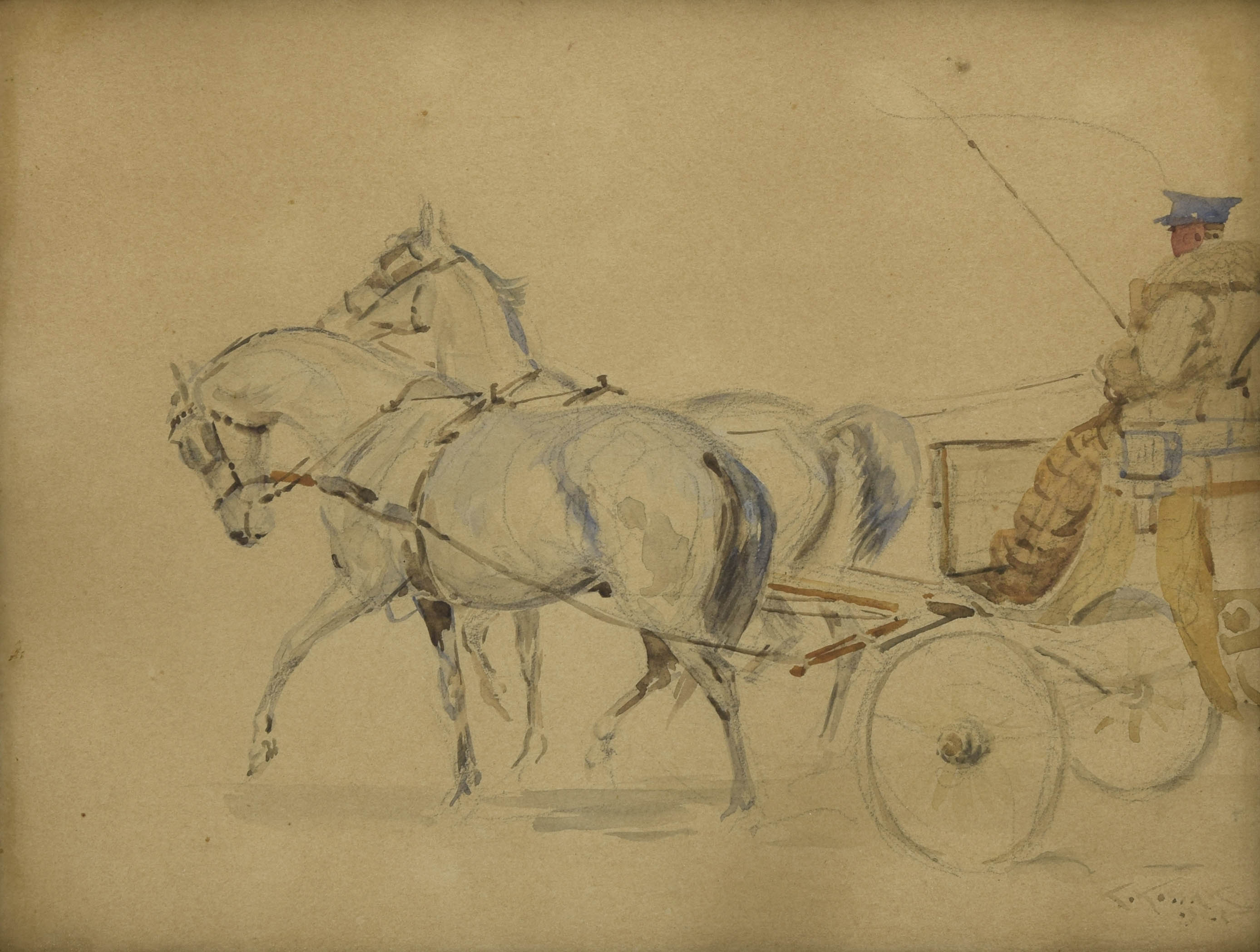 akwarela na podrysowaniu ołówkiem, papier; 22,5 x 29 (w świetle oprawy);sygn. p. d. K. Kossak / … (dalej zatarte).