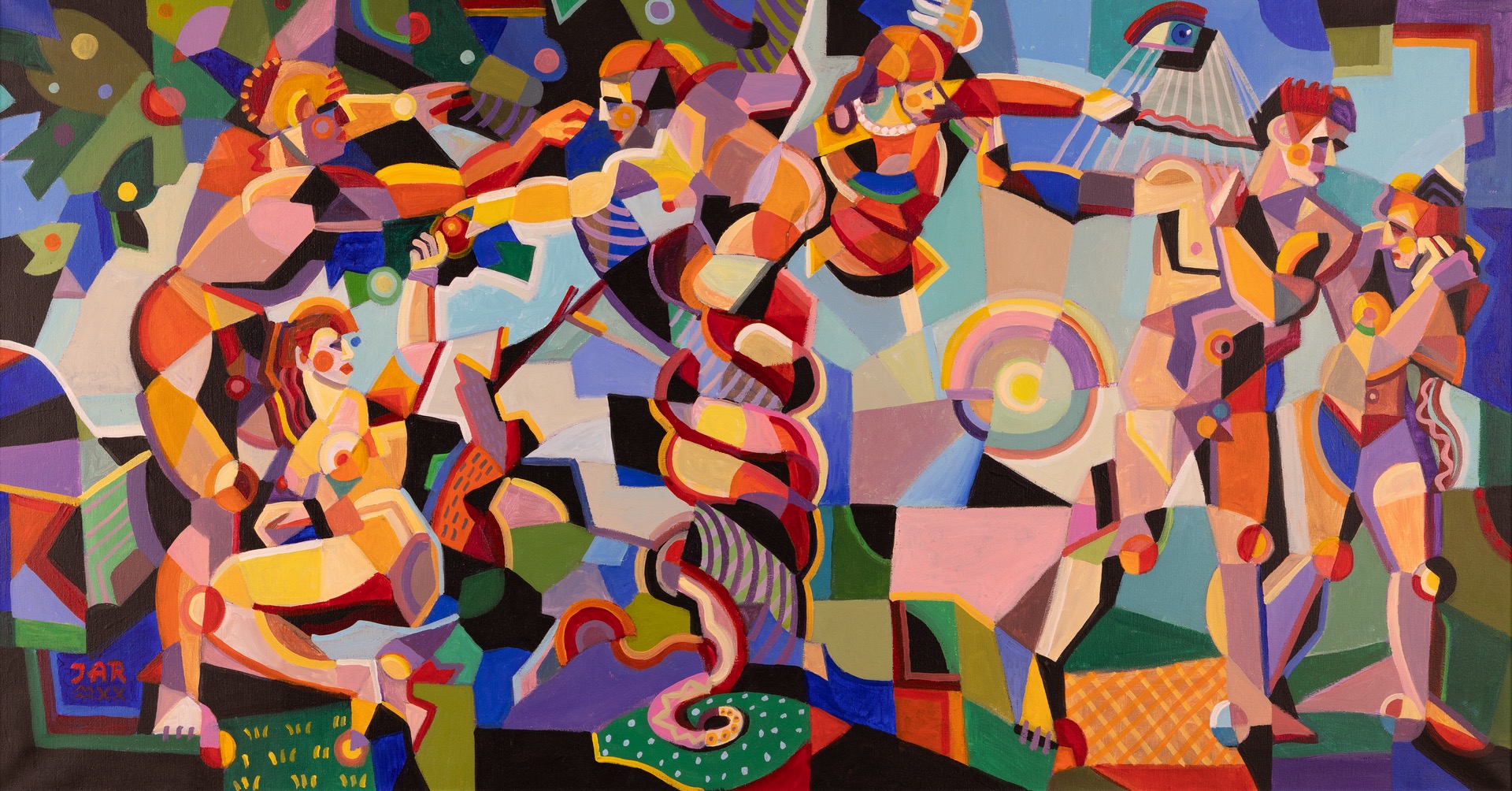 olej, płótno, 80 x 150 cm (w oprawie 108 x 176 cm),sygnowany l.d.: 'JAR | MMXX' oraz opisany na odwrocie: 'J. Reszka "Wygnanie z raju" Janusz Reszka'