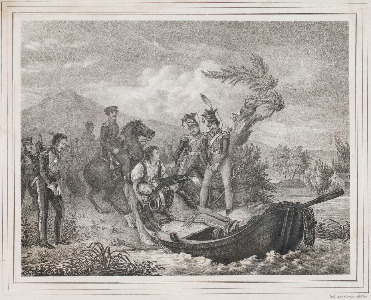 Litografia, papier; 17 x 21,5 cm (kompozycja) Sygnowana z kamienia pod ryciną: lith par George Müller U dołu napis: Le Prince Jos: Poniatowski Noyé, retiré de l'Elster Oprawiona