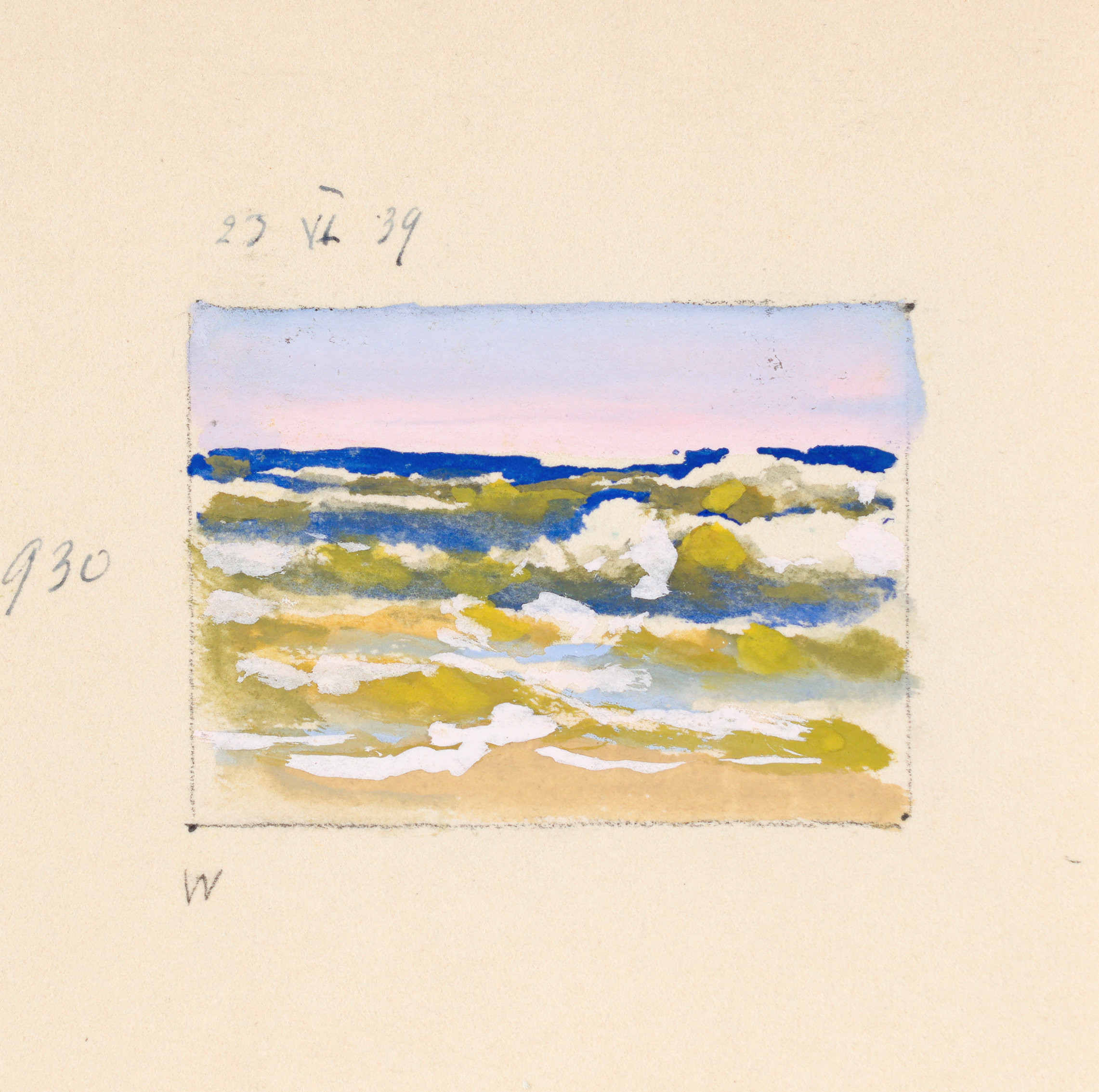 akwarela, gwasz, brystol; 14,1 x 10,9 cm (wym. arkusza), 4,9 x 6,7 cm (wym. rysunku); opis. autorsko u góry: 23 - VI 39 oraz numer. l. b.: 930. Na odwrocie rysunek: Widok na zarośla, 1939 (5 x 6,8 cm) również opisany autorsko.
