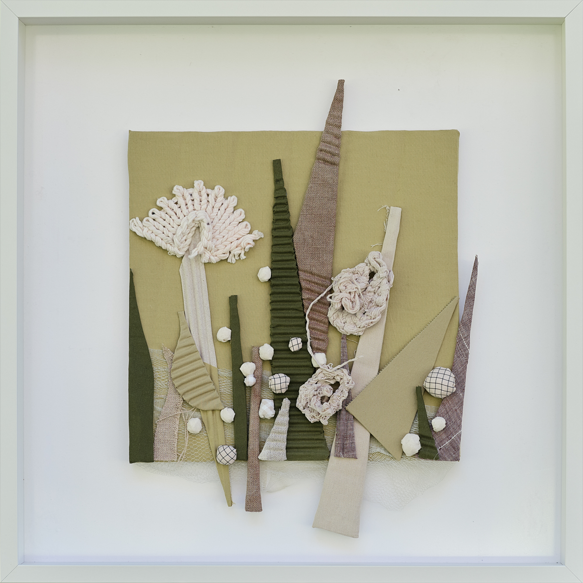 tkaniny naturalne i syntetyczne, włóczki naturalne i syntetyczne, nici poliestrowe, siatka nylonowa, tektura, technika własna, 42 × 32 cm (w oprawie 50 × 50 cm),