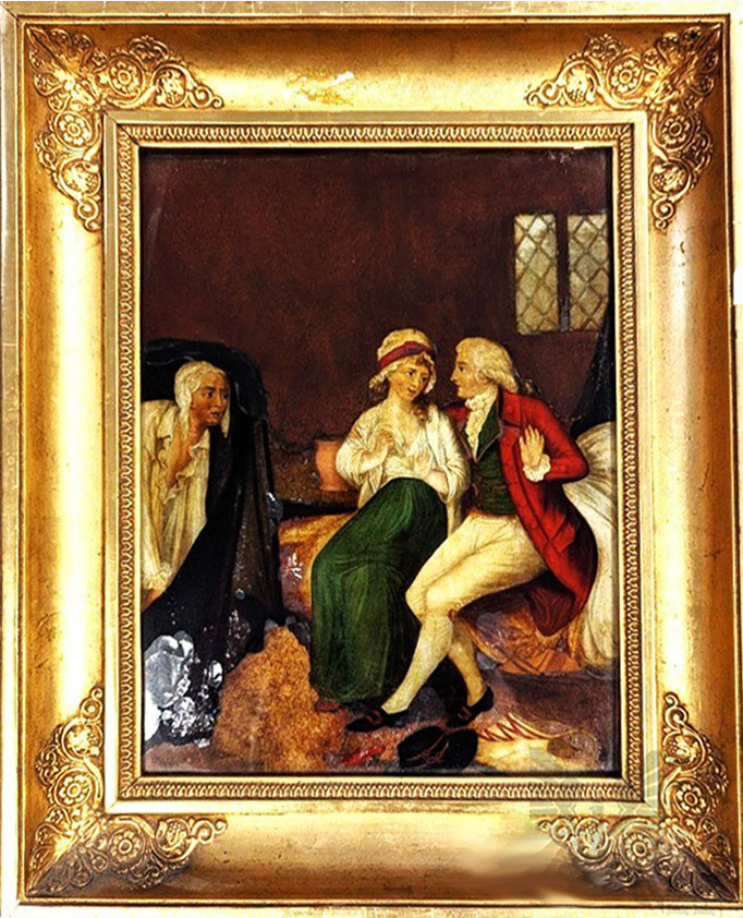 Olej, szkło eglomizowane 30 x 24 cm w świetle oprawy; oprawiony w złotą, ozdobną ramę o wym. 41 x 34 cm; na odwrociu wmontowana stara, dębowa deska.
