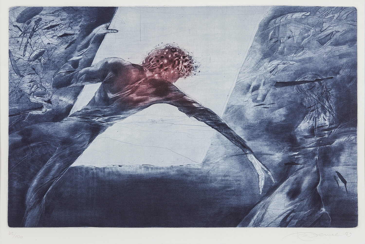 akwaforta, akwatinta, papier, 62/130, 31,3 x 48,7 cm (odcisk płyty), numerowana: l.d.: 62/130, sygn. p.d.: KDemel 89Oprawiona, passe-partout, wym. 53,5 x 68 cm