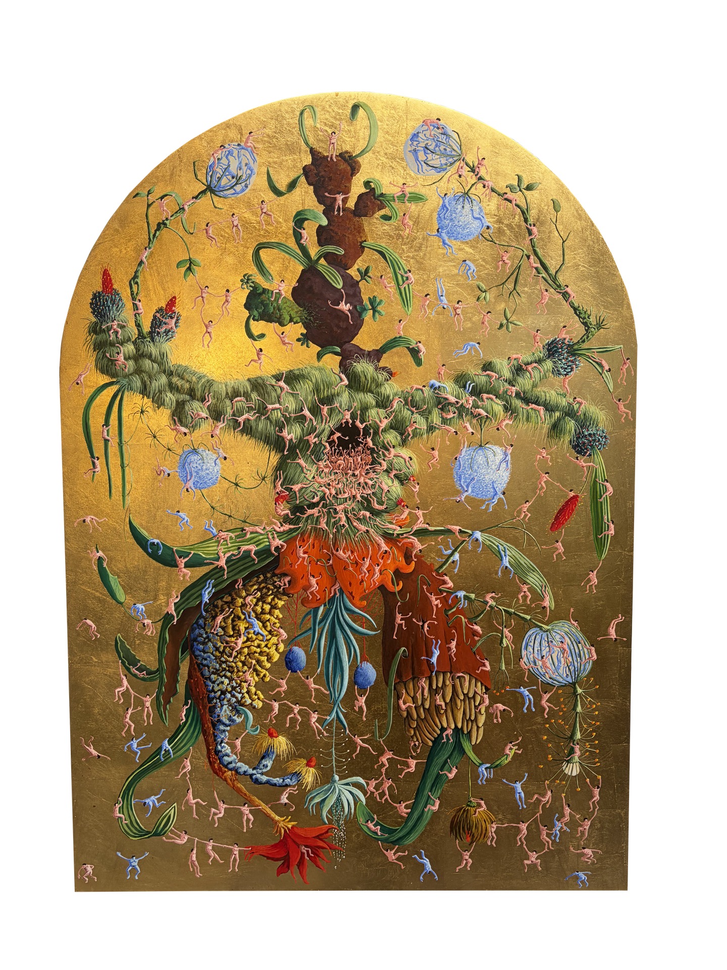 tempera, szlagmetal, sklejka, 100 x 70 cm, sygnowany na odwrocie: 'Z CYKLU | "KLĘSKA | URODZAJU" | NUMER | [13] | PIERWSZY OBRAZ | PO NARODZINACH | CÓRKI FLORY | CZYLI HISTORYCZNY | TOMASZ KULKA | 2021 | [monogram TK] Kulka'