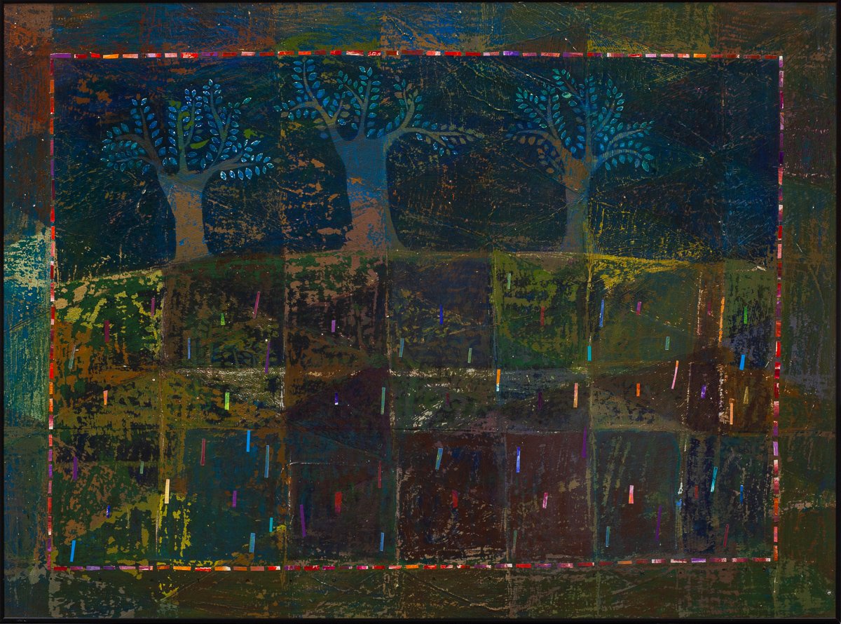 olej, akryl, kolaż, płyta, 75,5x102 cmopisany na odwrocie: Agata Dorobek z cyklu OGRODY akryl/collage 2015 102 cm x 75,5 cm