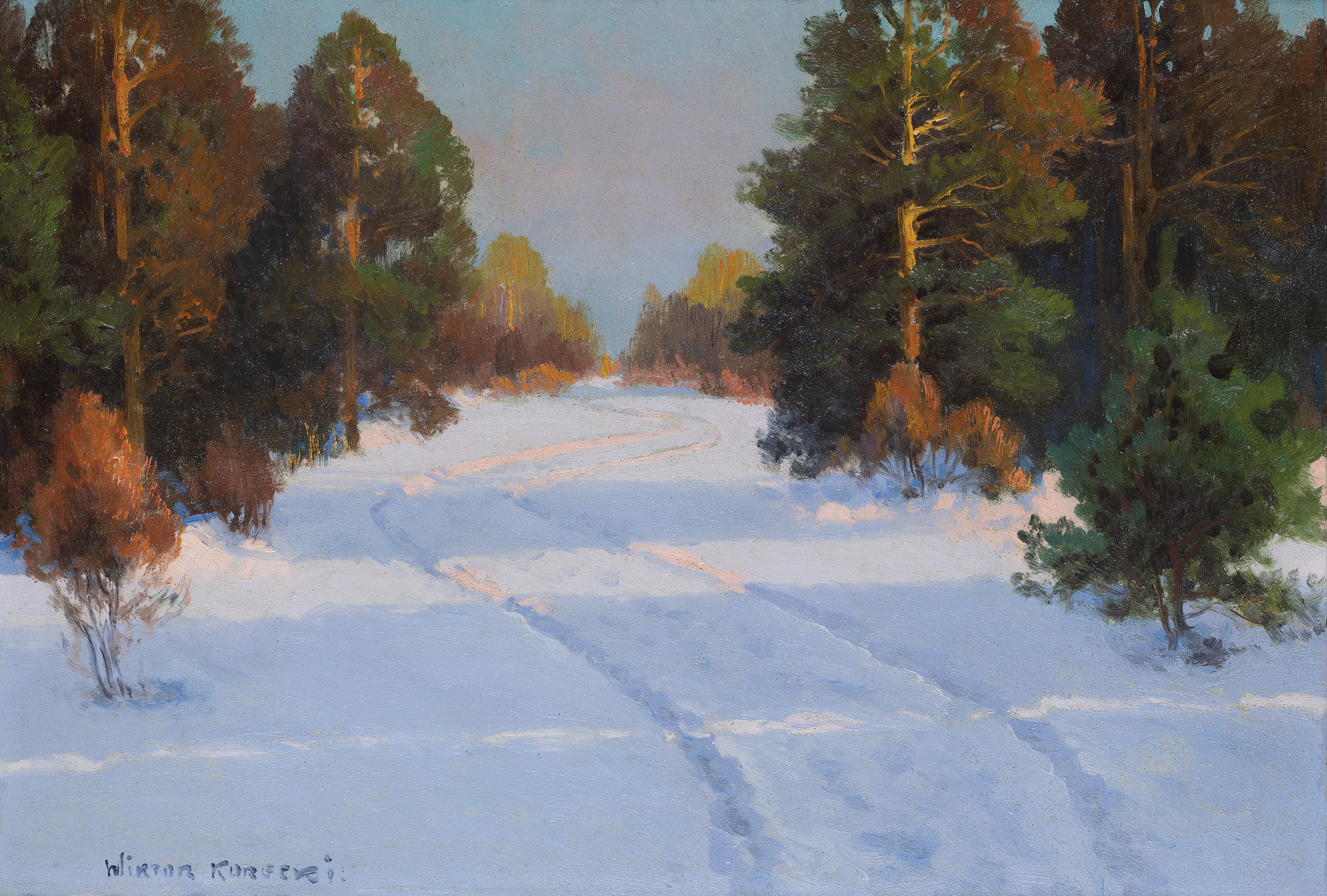 Wiktor Korecki (Kamieniec Podolski 1890 - Komorów k. Warszawy 1980) - malarz pejzażysta - gimnazjum ukończył w Kijowie, tam też studiował w Szkole Rysunkowej Aleksandra Muraszki. Po studiach wrócił do Kamieńca Podolskiego, skąd w roku 1921 wyjechał do Warszawy. Tu miał pracownię na rogu ulic Tamki i Cichej. Niestety zgromadzone tam obrazy spłonęły w czasie powstania 1944 roku. Po powstaniu artysta przebywał w obozie w Pruszkowie skąd trafił do obozu pracy w Lipsku. Do kraju powrócił w roku 1946 i zamieszkał w Komorowie pod Warszawą, a później w Milanówku. Jego nastrojowe krajobrazy emanujące spokojem i pogodą cieszyły się zawsze dużą popularnością. Korecki najczęściej malował pejzaże zimowe z motywem leśnej drogi i strumienia wijącego się wśród śniegów, a obok nich także wiosenne, letnie czy jesienne widoki z Mazowsza.