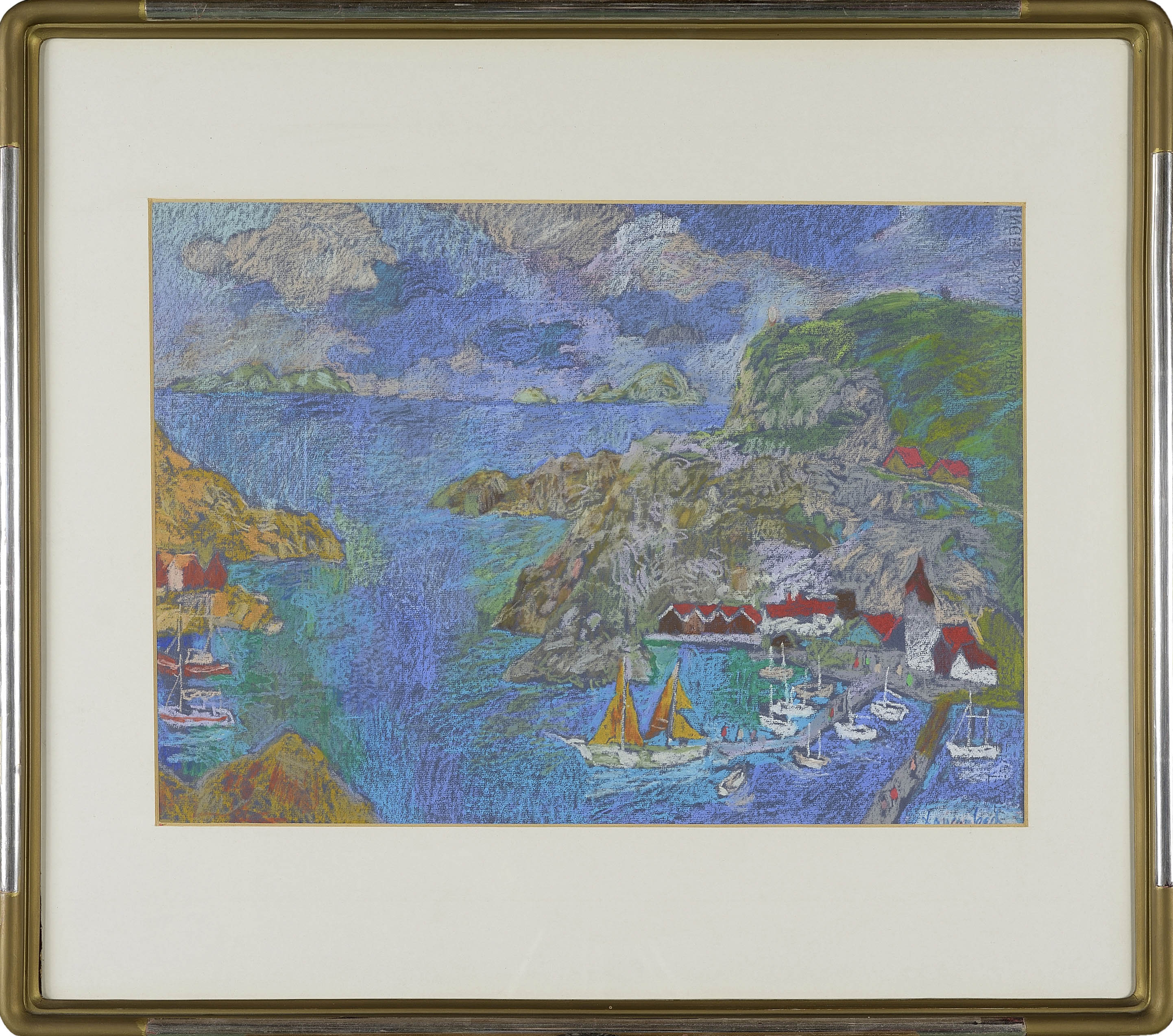 sygn. p.d.: Xancenbach, na odwrocie naklejka TPSP w Krakowie, pejzaż ze szwedzkiego miasta Smögen.