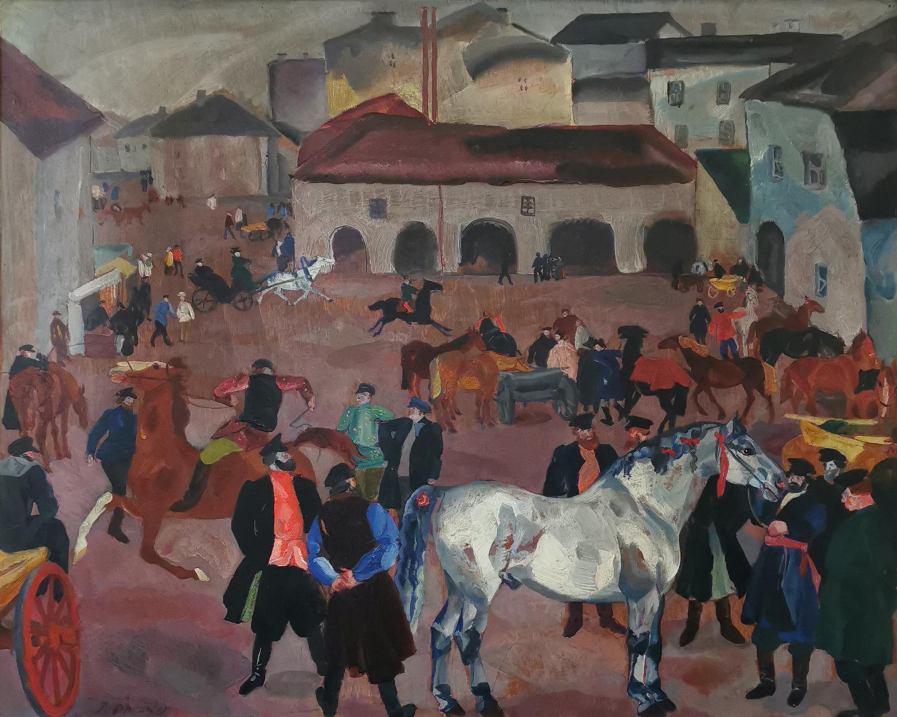 olej, sklejka, 58 x 72 cm;sygn. i dat. l. d.: R. Frenc 1927 (cyrylicą);na odwrocie napis cyrylicą: N4 / Pokupka / żerebca / … (cyrylicą).