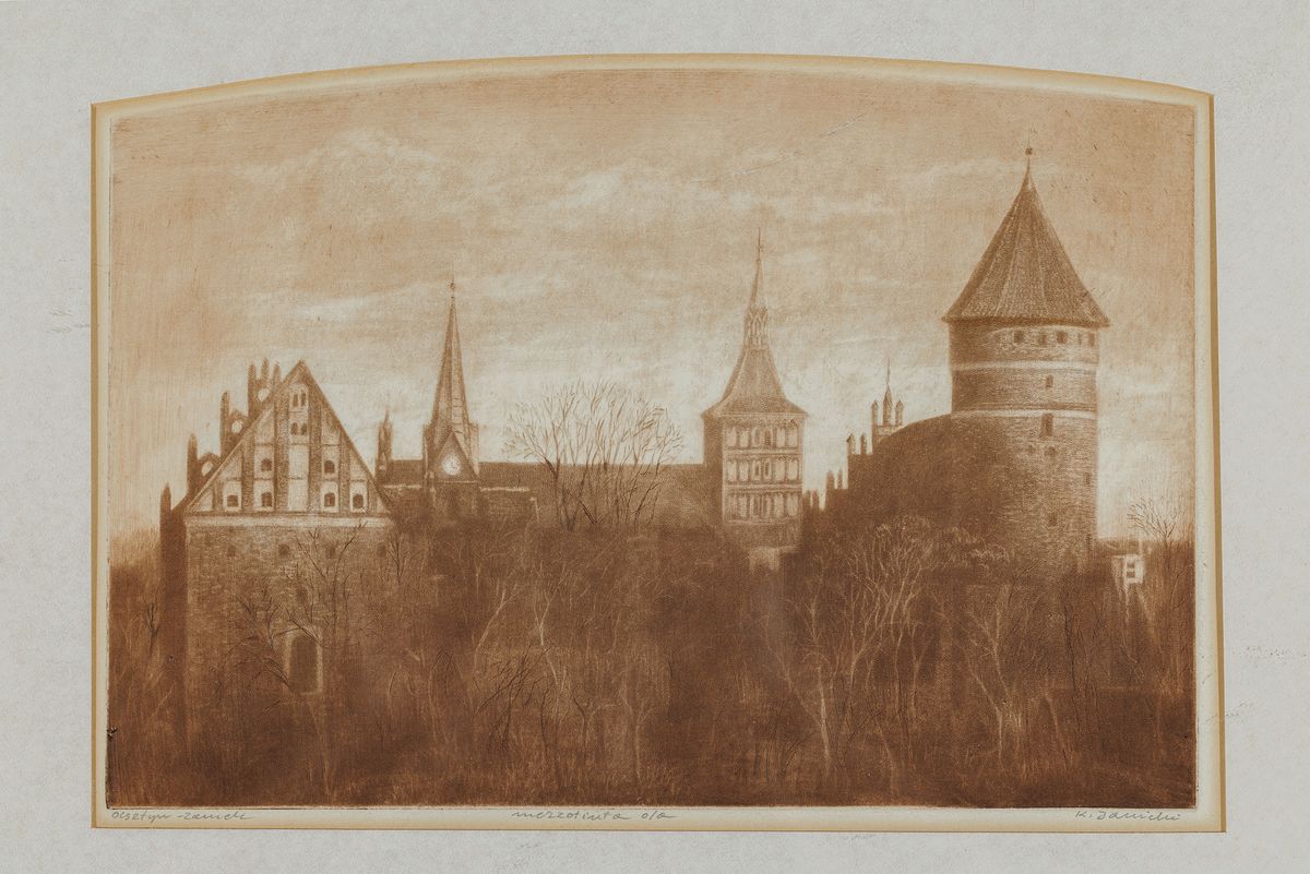Sygnowany ołówkiem pod ryciną: Olsztyn – Zamek mezzotinta o/a K. Janicki