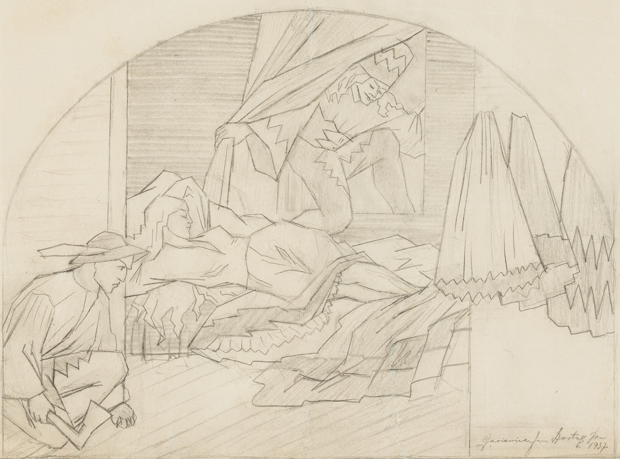 ołówek na papierze, 23 x 31 cm,sygnowany i datowany w prawym, dolnym rogu: "Gąsienica Jan Szostak Sen | 6. 1937".