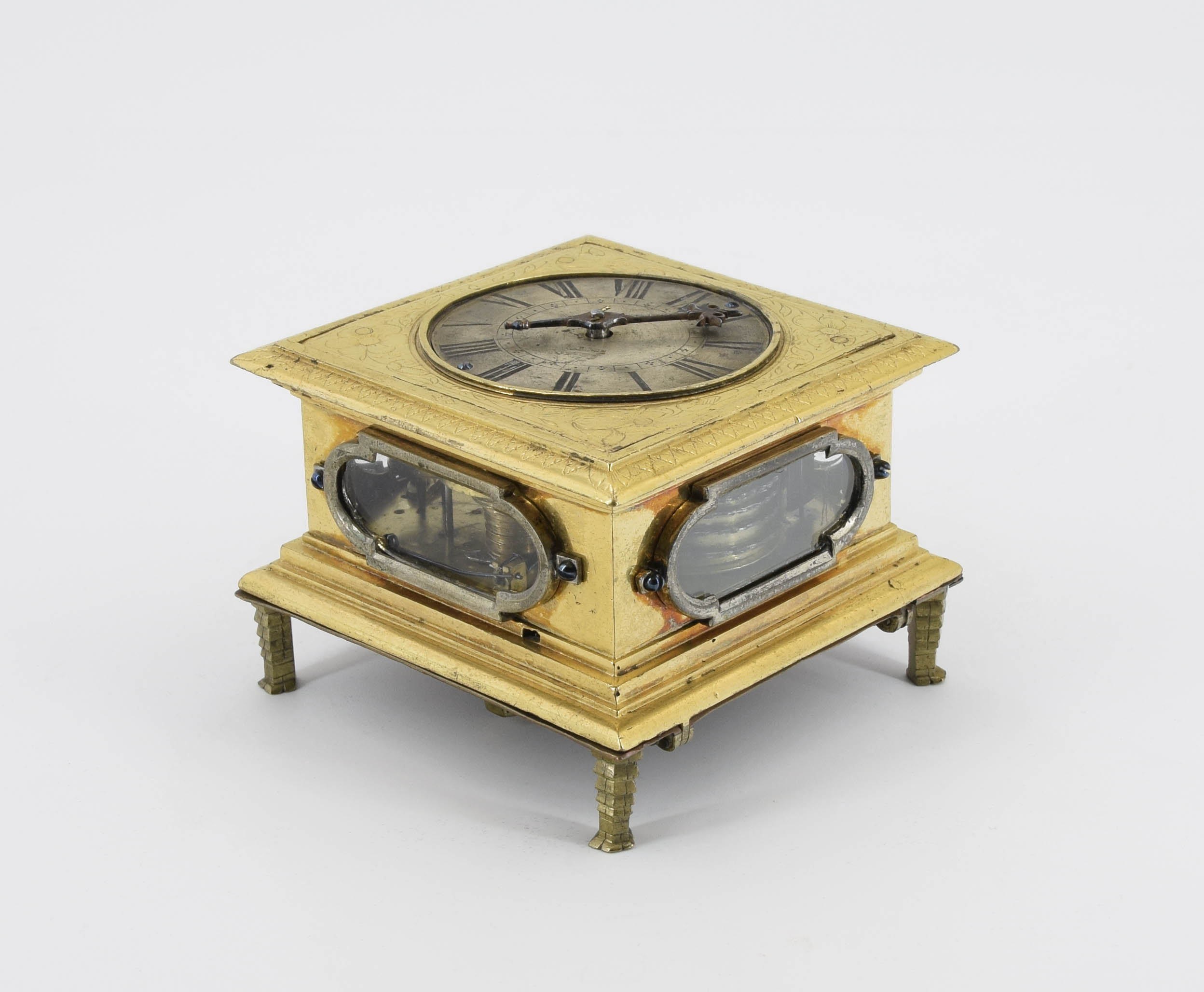 mechanizm: mosiądz, stal, dzwonek: spiż, obudowa i tarcza: mosiądz złocony i srebrzony, okienka: srebro niskopróbne, szkło; odlewanie, cyzelowanie, wycinanie, grawerowanie, złocenie, srebrzenie, oksydowanie; 7,9 x 10,3 x 10,3 cm; tarcza, 8,2 x 8,2 cm, średn. plakiety: 6,4 cm;