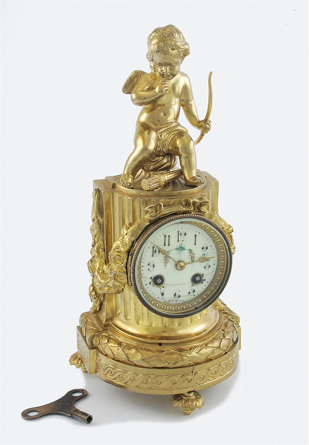 Podstawa półkolista, wsparta na 3 nóżkach z kołnierzami z listków akantu; wzdłuż krawędzi pas plecionki, wyżej ornament z liści lauru ze wstęgą. Korpus zegara w formie kanelowanej półkolumny; w zwieńczeniu figurka siedzącego Amora z łukiem w lewej rączce i kołczanem pełnym strzał, leżącym u jego stóp. Od frontu na kolumnie - tarcza zegara biało emaliowana, z cyframi arabskimi i malowanym pośrodku festonem różanym, obramowana kimationem, osłonięta szklanymi drzwiczkami w otoku z perełek. Nad tarczą i po bokach - pełnoplastyczna różana girlanda przewiązana kokardą. Za szklanymi drzwiczkami z tyłu - widoczna płyta mechanizmu z bitym napisem w kole: "AD. MOUGIN DEUX MEDAILLES" oraz owalnym znakiem z literami "F C" rozdzielonymi wyobrażeniem Legii Honorowej; ponadto bite numery: "1121", "42". Zegar bije godziny i półgodziny.