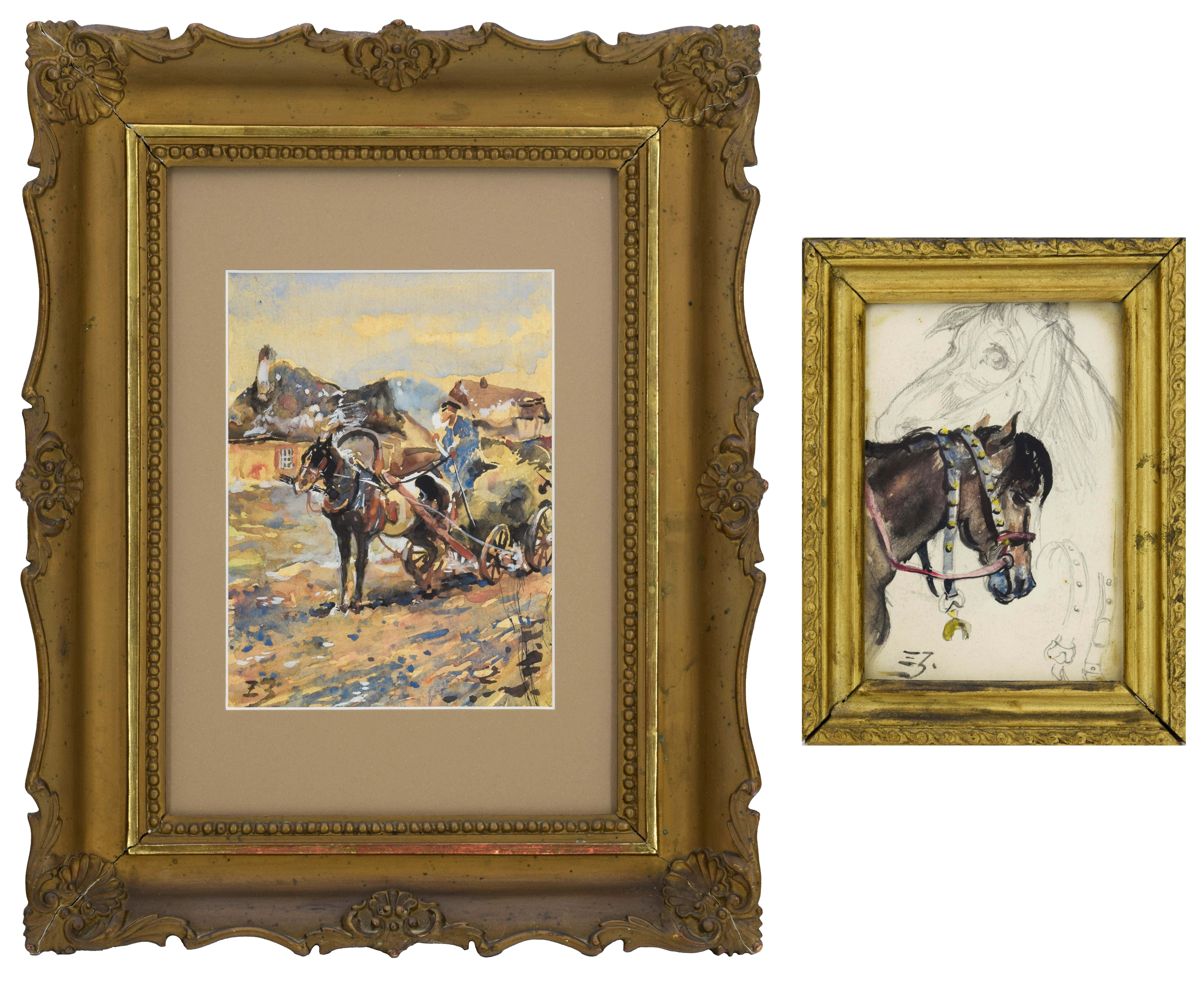 1. Zwózka sianaakwarela, papier; 16 x 12 cm (w świetle oprawy);sygn. l. d.: ZJ (monogramem);2. Studium głowy koniaołówek, akwarela, papier; 13,5 x 9 cm (w świetle oprawy);sygn. l. d.: ZJ. (monogramem).