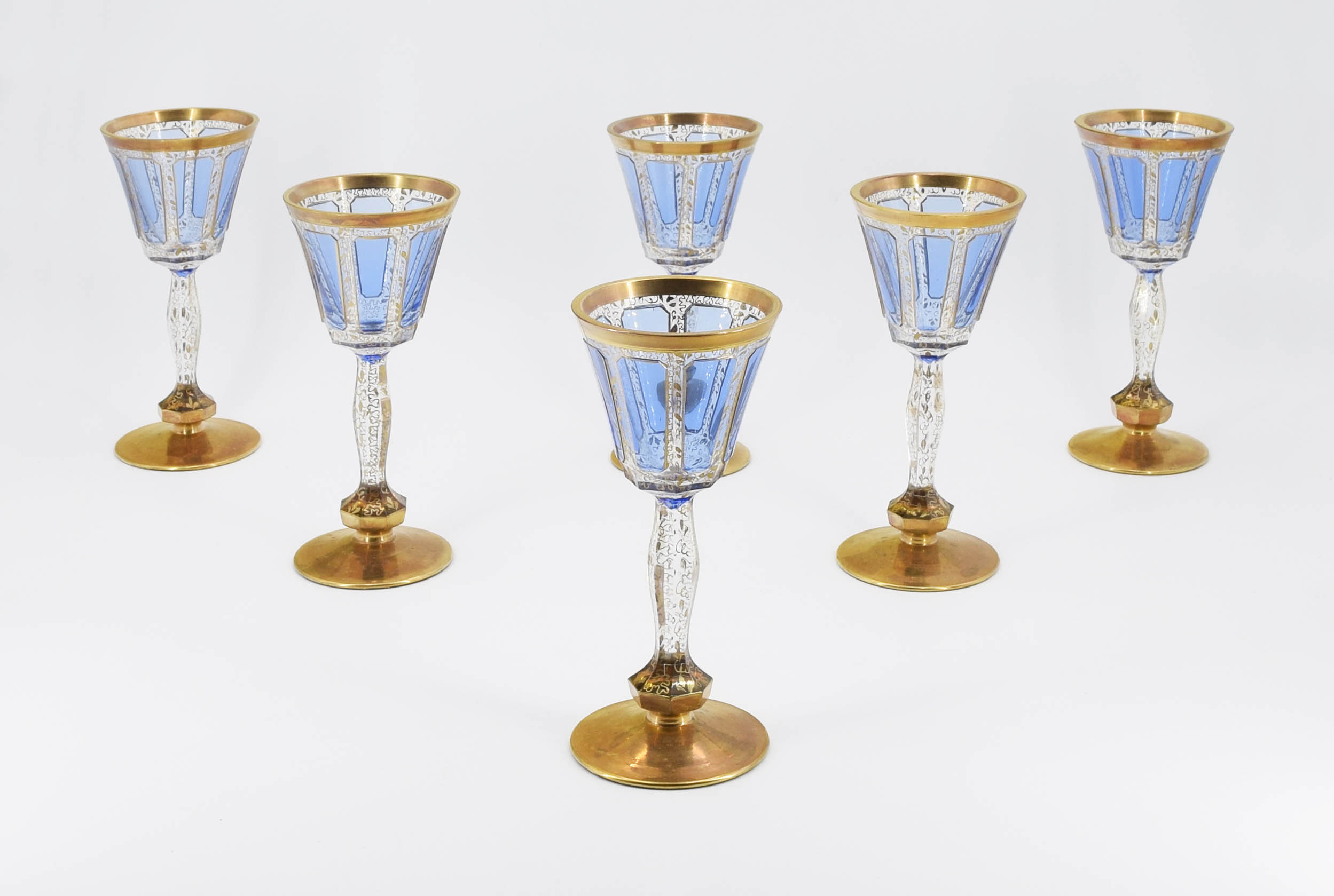 Koliste, złocone stopki, smukłe trzony, czarki błękitne, brzegi złocone.