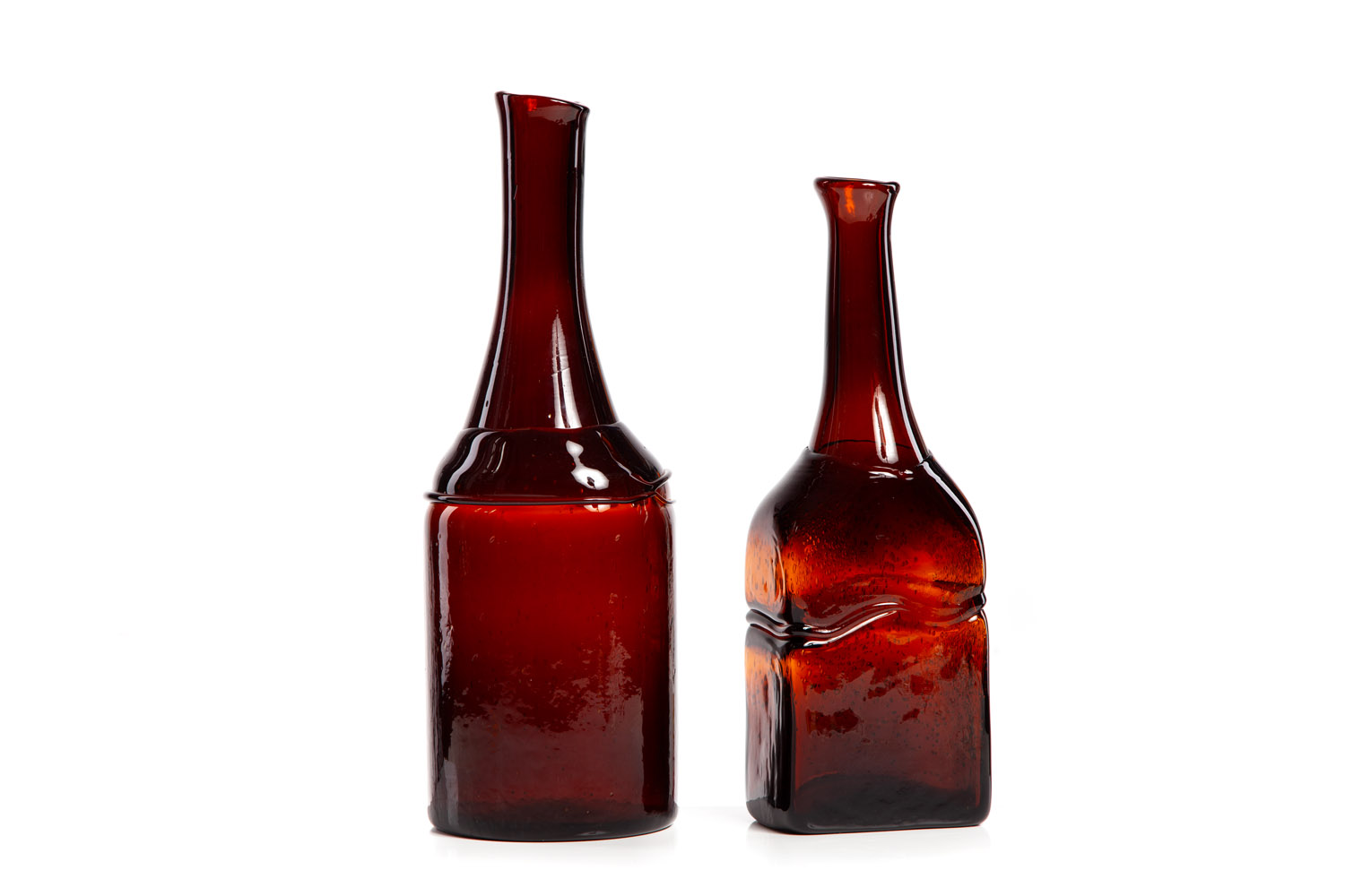 szkło sodowe formowane ręcznie; 29 i 34 cmpracownia autorska, lata 80./90. XX w.Stan zachowania: większa butla ma wewnątrz rysę.