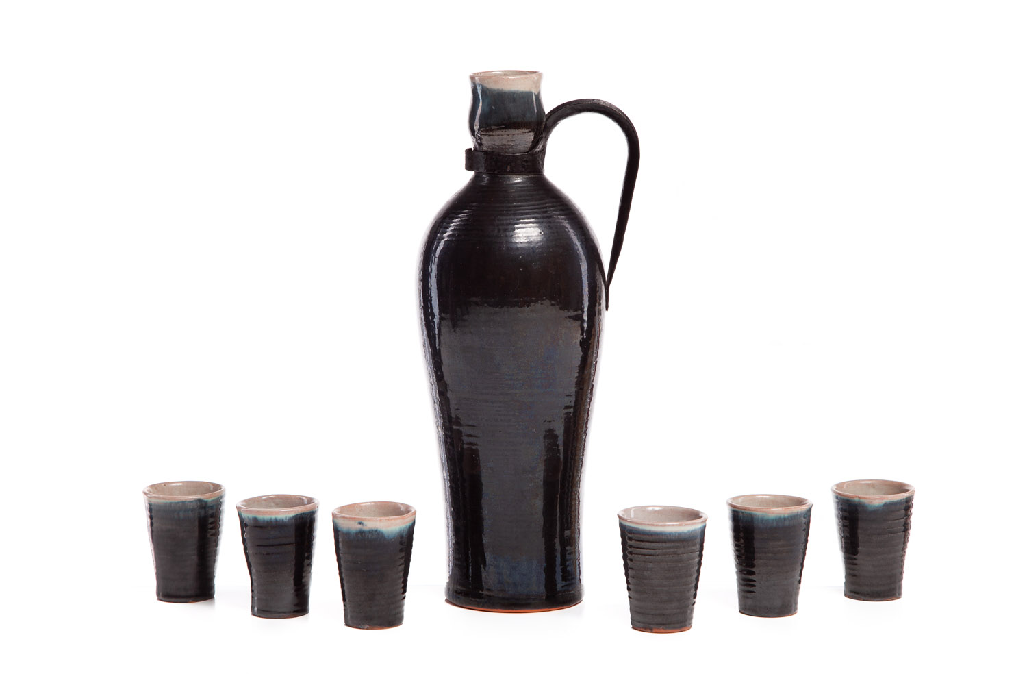 glina szkliwiona, szkliwa zaciekowe, okucie metalowe; karafka 27,5 cm, 6 kieliszków wys. 6 cm Spółdzielnia Pracy Rękodzieła Ludowoego i Artystycznego "Kamionka" w Łysej Górze, 3. tercja XX w.