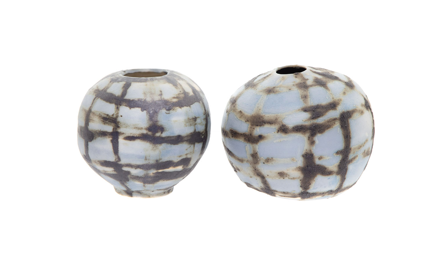 kamionka barwiona chlorkiem kobaltu i tlenkami manganu i miedzi, 10 x 11 x 10,5 cm,10 x 9,5 x 9 cmjeden z wazoników sygnowany i datowany na spodzie: (znak artystki) | 'm | 1988'