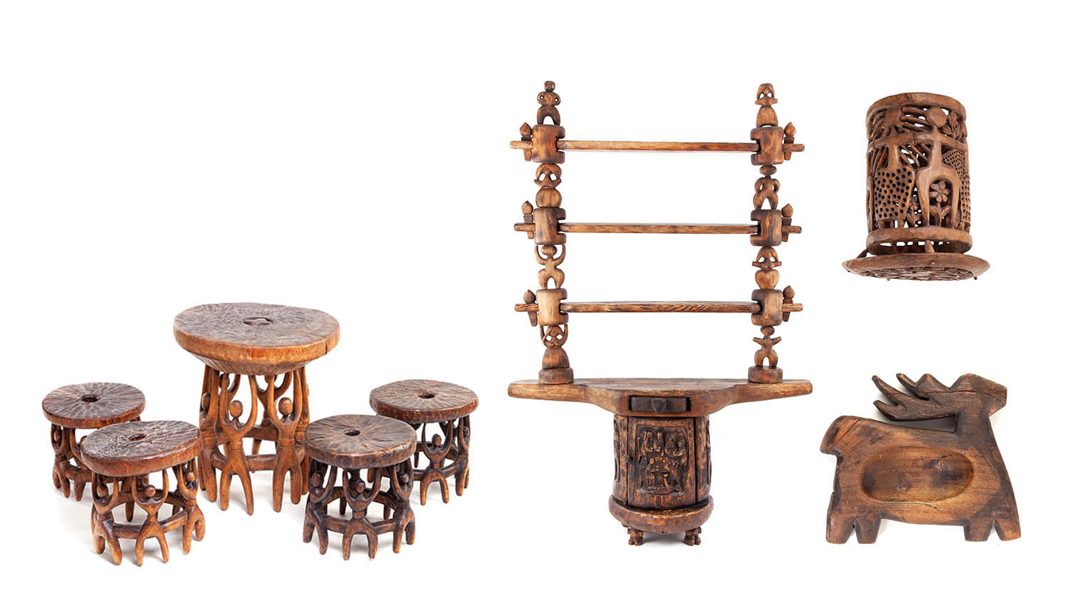 drewno, regał: 244 x 168 x 56 cm, stół: 63 x 57 x 57 cm, stołki: 37 x 36 x 36 cm, abażur: 37,7 x 33 x 34 cm, popielniczka: 3 x 16 x 12,5 cm
